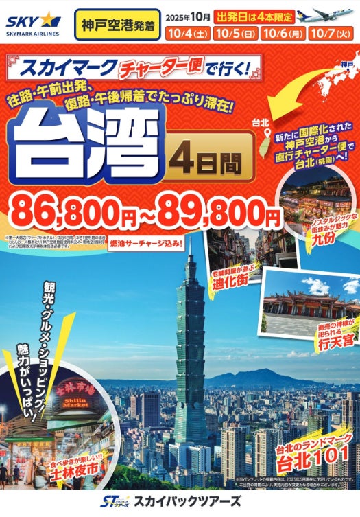 スカイパックツアーズ株式会社(本社:東京都中央区、社長:横山正巳)は、スカイマークチャーター便を利用した価格固定型のパンフレット旅行商品「スカイステイション台湾4日間(燃油サーチャージ込)」【神戸空港発着】(2025年10月4日出発~10月7日出発)の販売を開始します。