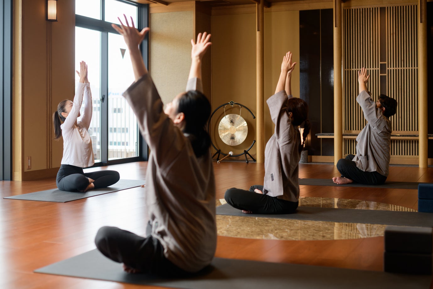 朝陽を迎えるサンライズ太陽礼拝や、自然の営みを重ねたハーベストフローを通して1日の代謝を高め、呼吸をゆるやかに整えていきます。