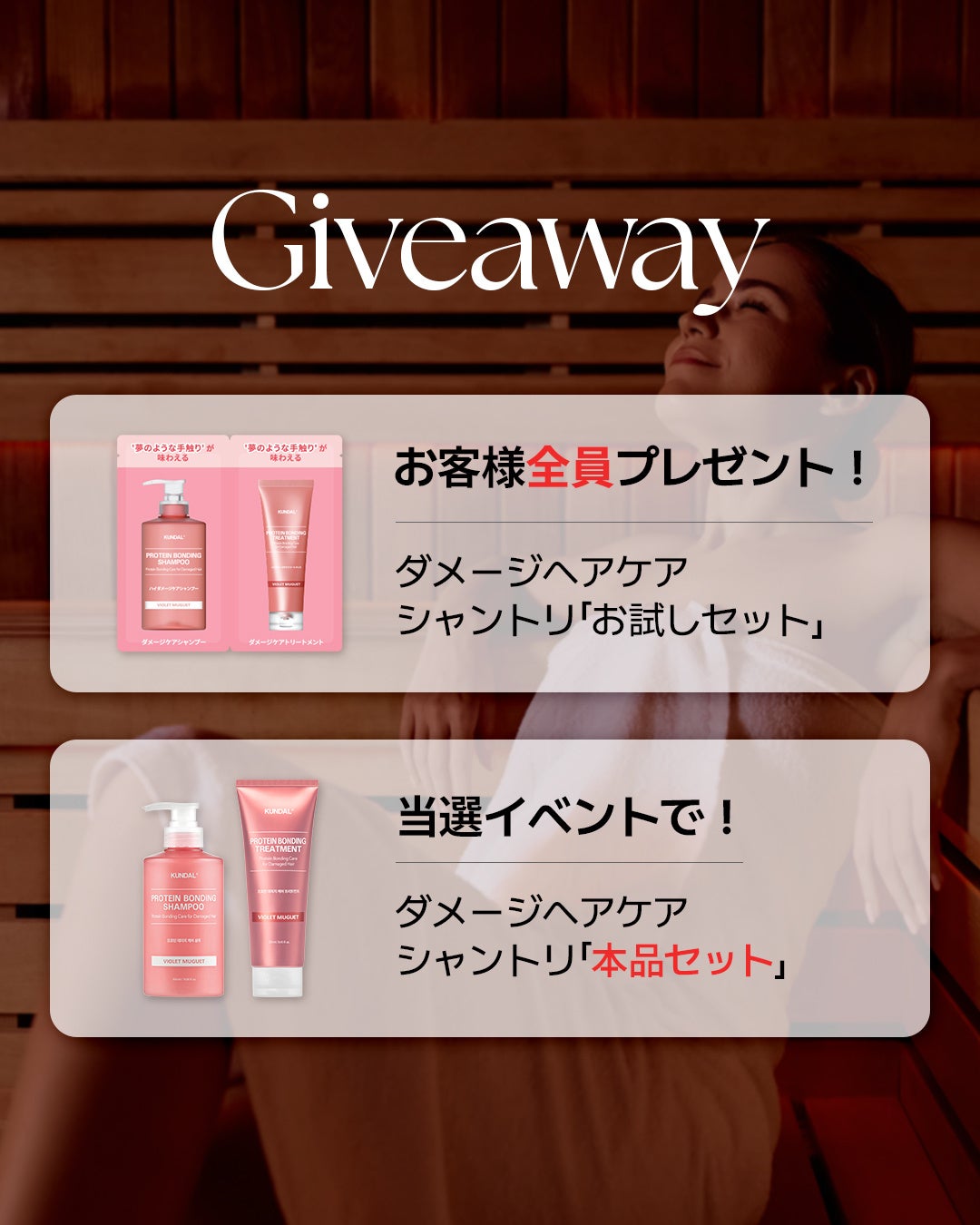 今回のコラボレーションでは、乾燥しやすい冬のサウナ後のヘアケアに着目し、KUNDALの中でも特に人気の高い「ダメージヘアケアライン」を来館者全員にサンプリングとして提供いたします。さらに、抽選で同シリーズの本品が当たるスペシャルプレゼント企画もご用意しております。