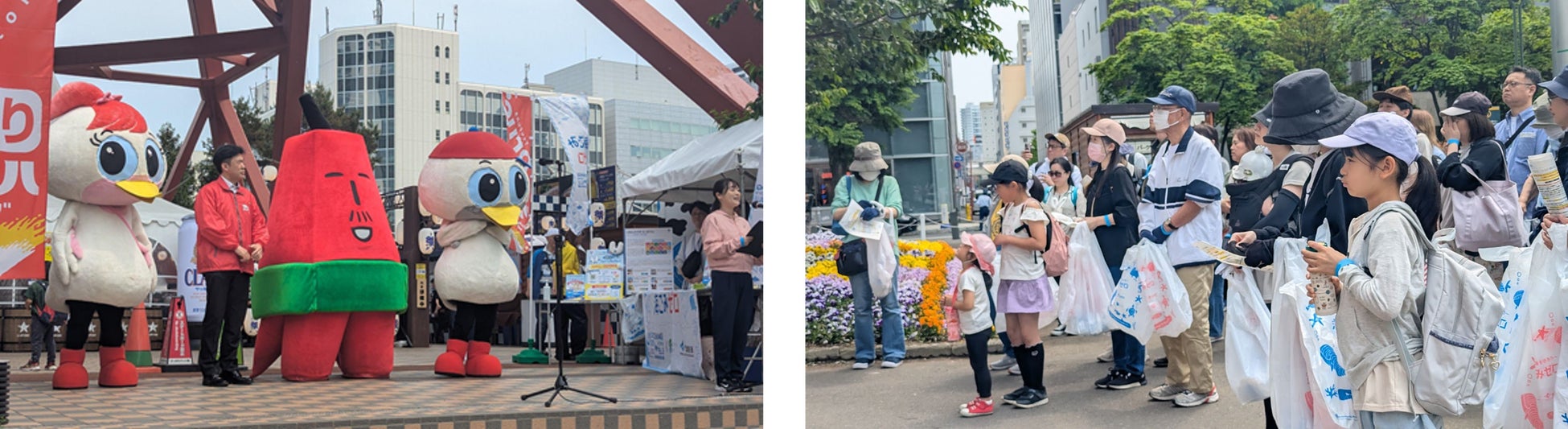 ・開催概要:参加者が札幌テレビ塔の非公式キャラクター「テレビ父さん」とツルハドラッグのマスコット「つるくん」「つるちゃん」と一緒に札幌・大通公園&創成川公園でごみ拾い。