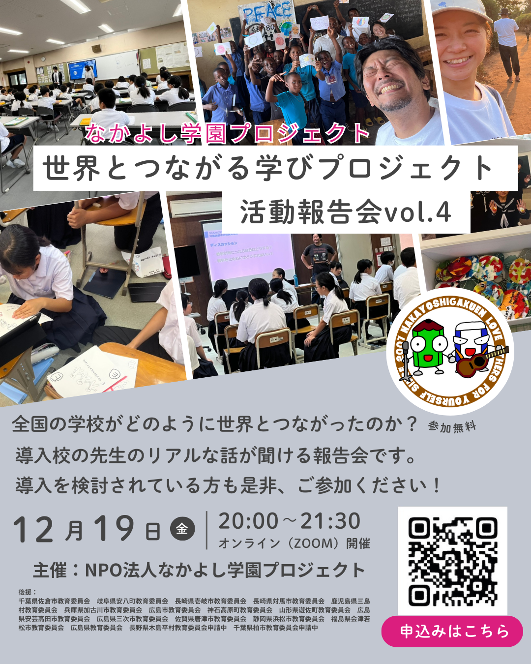 特定非営利活動法人なかよし学園プロジェクト(代表:中村雄一/千葉県松戸市)は、全国の学校とアフリカ・中東・アジアの現場をむすぶ「世界とつながる学びプロジェクト」の 活動報告会vol.4 を、2025年12月19日(金)20:00〜21:30、オンライン(Zoom)にて開催いたします。参加費は無料です。