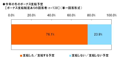 「ボーナス支給制度あり」の回答者138名に今年の冬のボーナスを支給したか、または支給する予定かどうかを尋ねたところ、不況の影響からか「支給しない/支給しない予定」は23.9%にのぼることが明らかになりました。