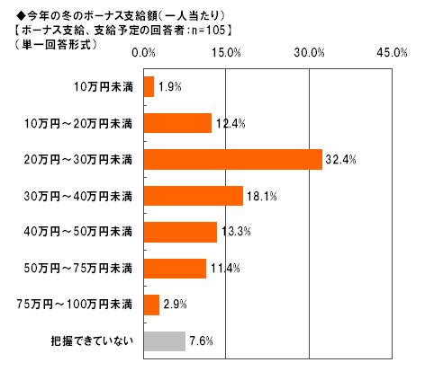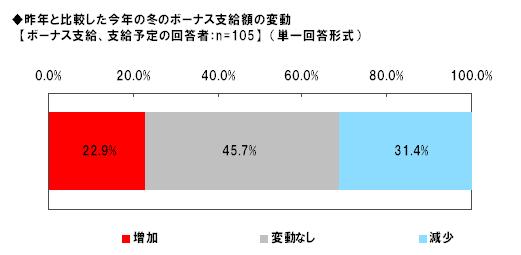 「ボーナスを支給する/支給する予定」の回答者105名に、今年の冬のボーナスの支給額(一人当たり)は、昨年と比べるとどう変化しているかを聞いたところ、「増加」は22.9%、「変動なし」45.7%、「減少」は31.4%となり、約半数が昨年と同様であることが明らかになりました。さらに支給額(一人当たり)を尋ねたところ、最も回答が多かったのは「20万円~30万円未満」32.4%、続いて「30万円~40万円未満」18.1%、「40万円~50万円未満」13.3%となり、「20万円~50万円未満」が6割を占めるという結果になりました。