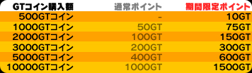 GTコインをチャージした時に獲得できるGTポイントを、期間中150%増量いたします!