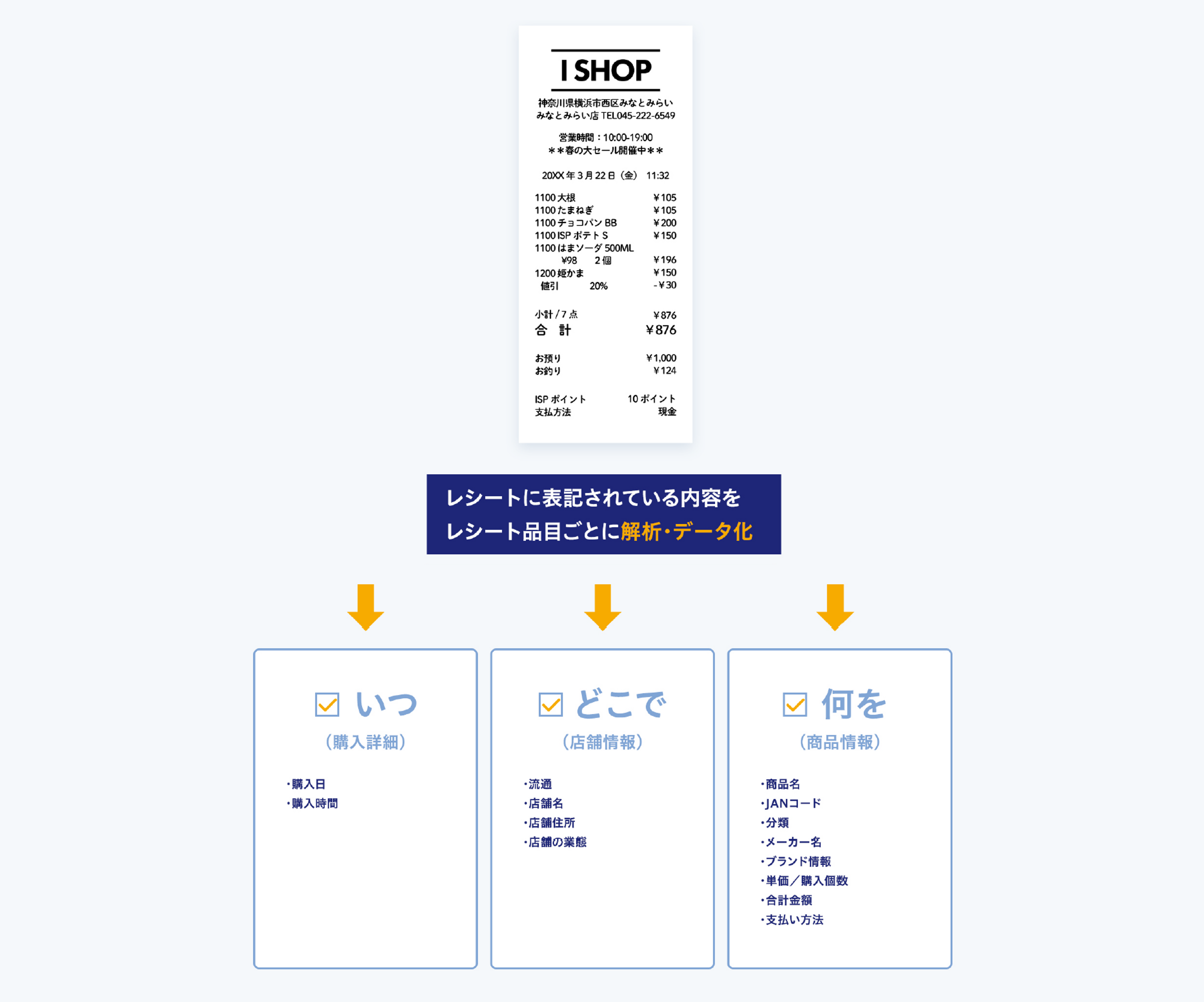 アイエスピーが日々収集している、全国の大手約200流通の食用品・日用品のレシート情報と突合し、レシートに記載される内容から「いつ」「どこで」「何の」商品を購入されたのかを解析する、レシートに特化したデータソリューションです。