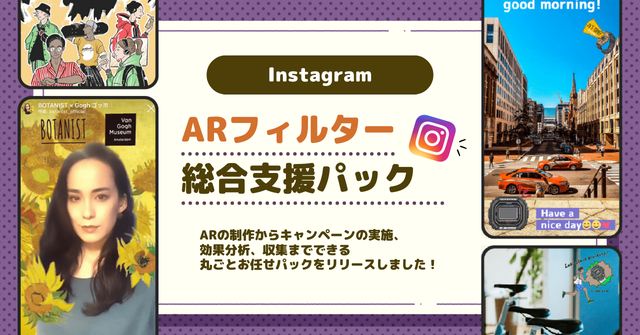 他にも、Instagram(インスタグラム)上でのARフィルター投稿キャンペーンをAR企画・制作~投稿収集・拡散効果の分析まで一気通貫で支援する新プラン「インスタ×ARフィルター総合支援パック」もご提供しています。