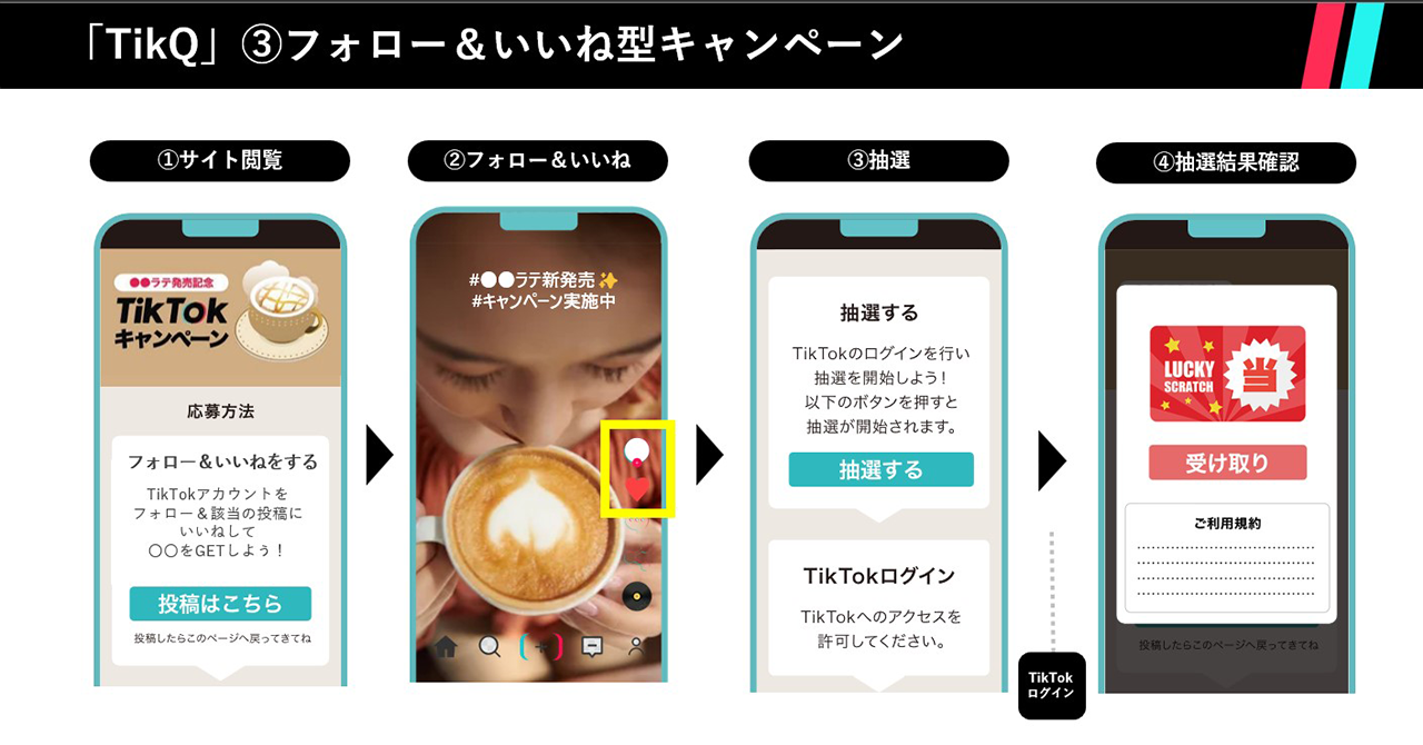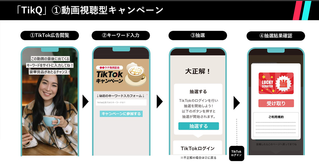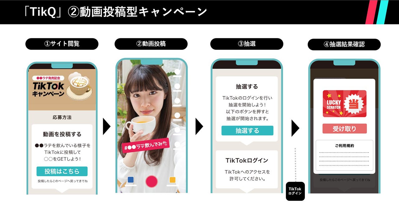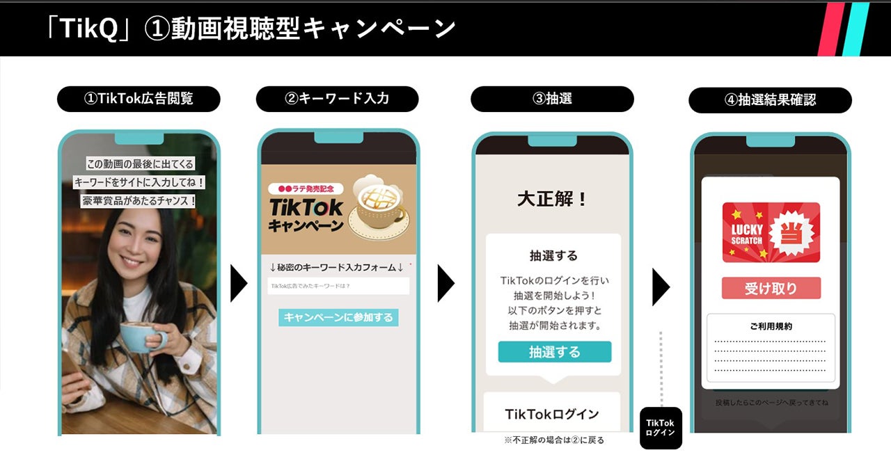 マインドフリーが独自に開発したインスタントウィン型TikTokキャンペーンツール「TikQ(ティッキュー)」は、TikTokキャンペーンを実施する際に必要な、応募者データの管理、抽選などのすべての機能をカバーするキャンペーンツールです。 企業ご担当者さまは、「TikQ」を利用することで手軽にTikTokキャンペーンを実施することができます。
