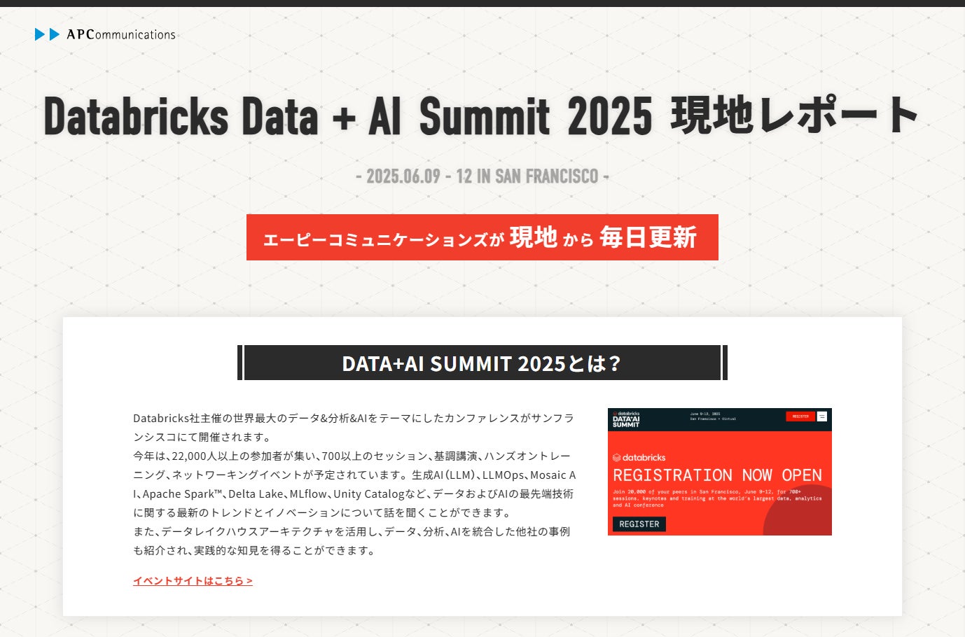 株式会社エーピーコミュニケーションズは、2025年6月9日からサンフランシスコで開催される「Databricks社 Data + AI Summit 2025」の情報をリアルタイムにお届けするレポートサイト「Databricks Data + AI Summit 2025 現地レポート」を2025年5月29日に公開しました。