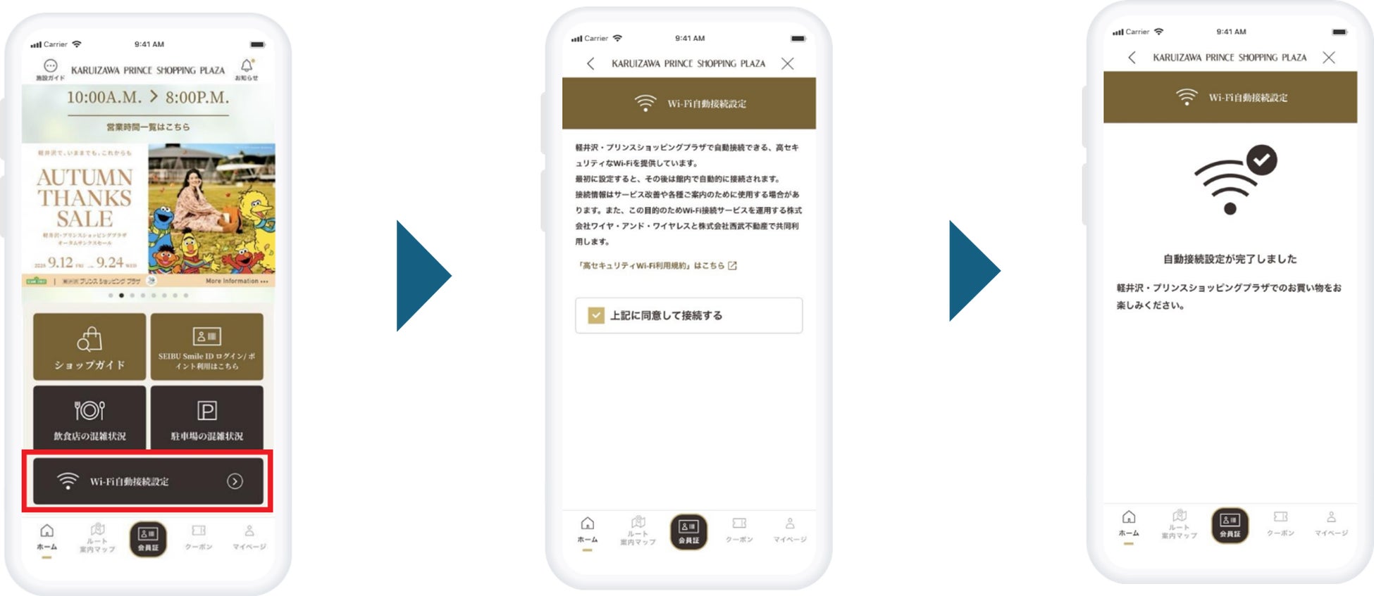 軽井沢PSPアプリのホーム画面上に新たに設置された「Wi-Fi自動接続設定」ボタンをタップし、画面の案内に従って操作いただくだけで、Wi-Fiの接続設定が完了します。一度設定を行えば、次回以降は設定作業が不要となり、施設ご利用時に自動的に高セキュリティなWi-Fiへ接続されます。