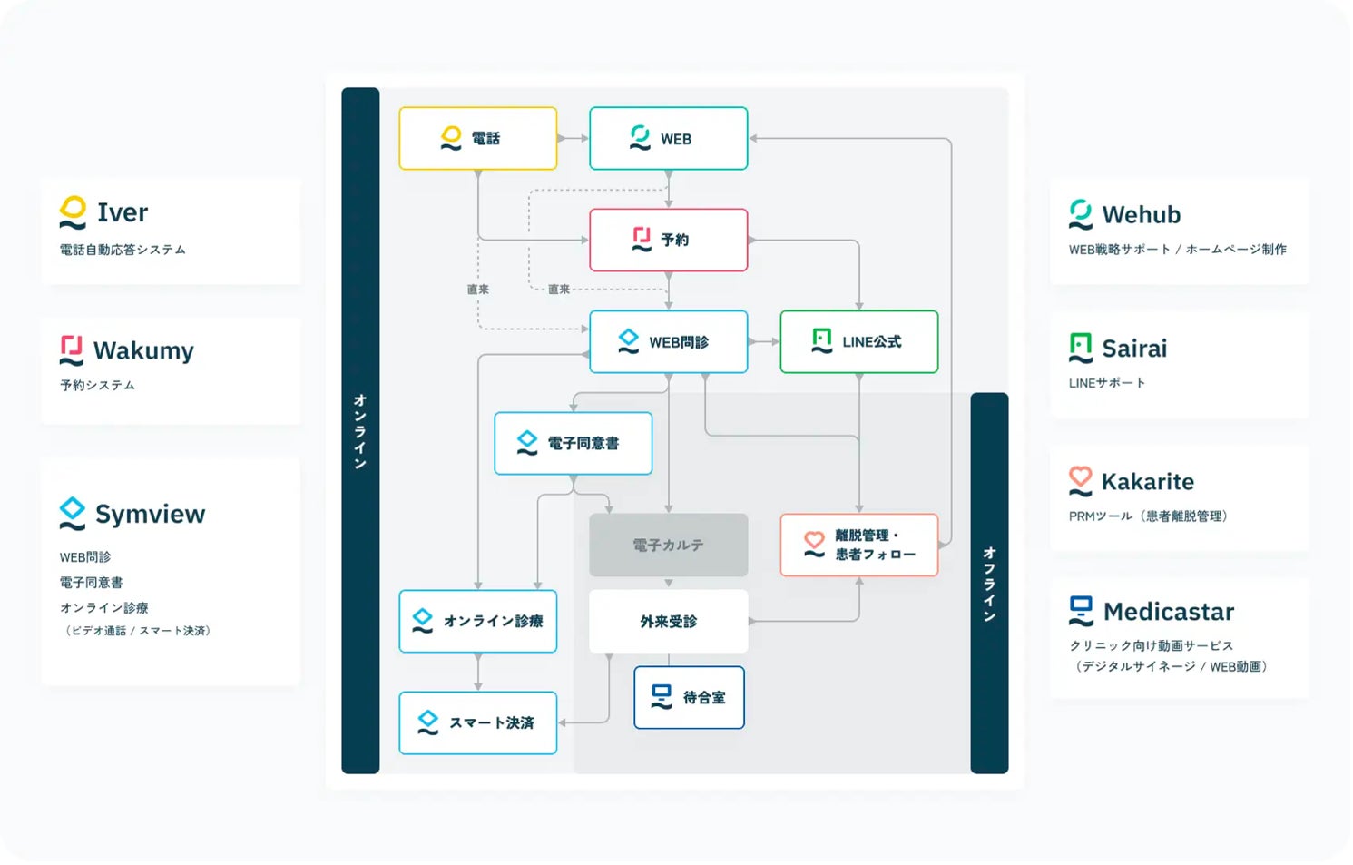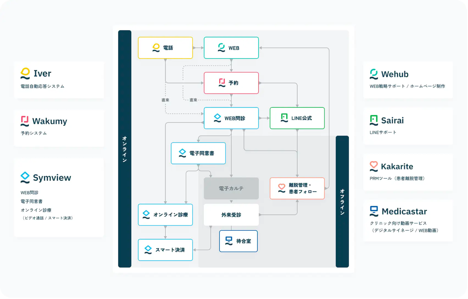 患者の受診動線を、レイヤードのプロダクトでトータルに対応することができます。