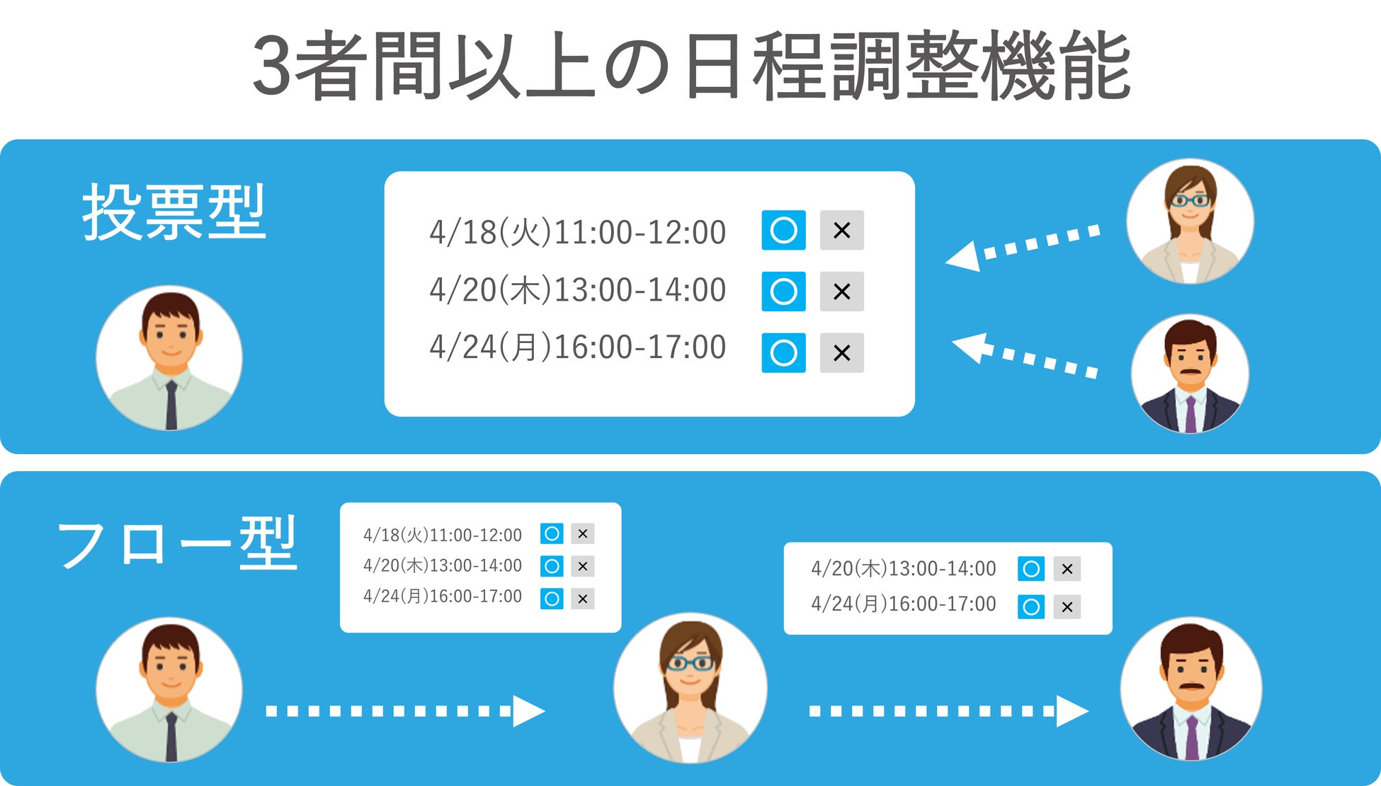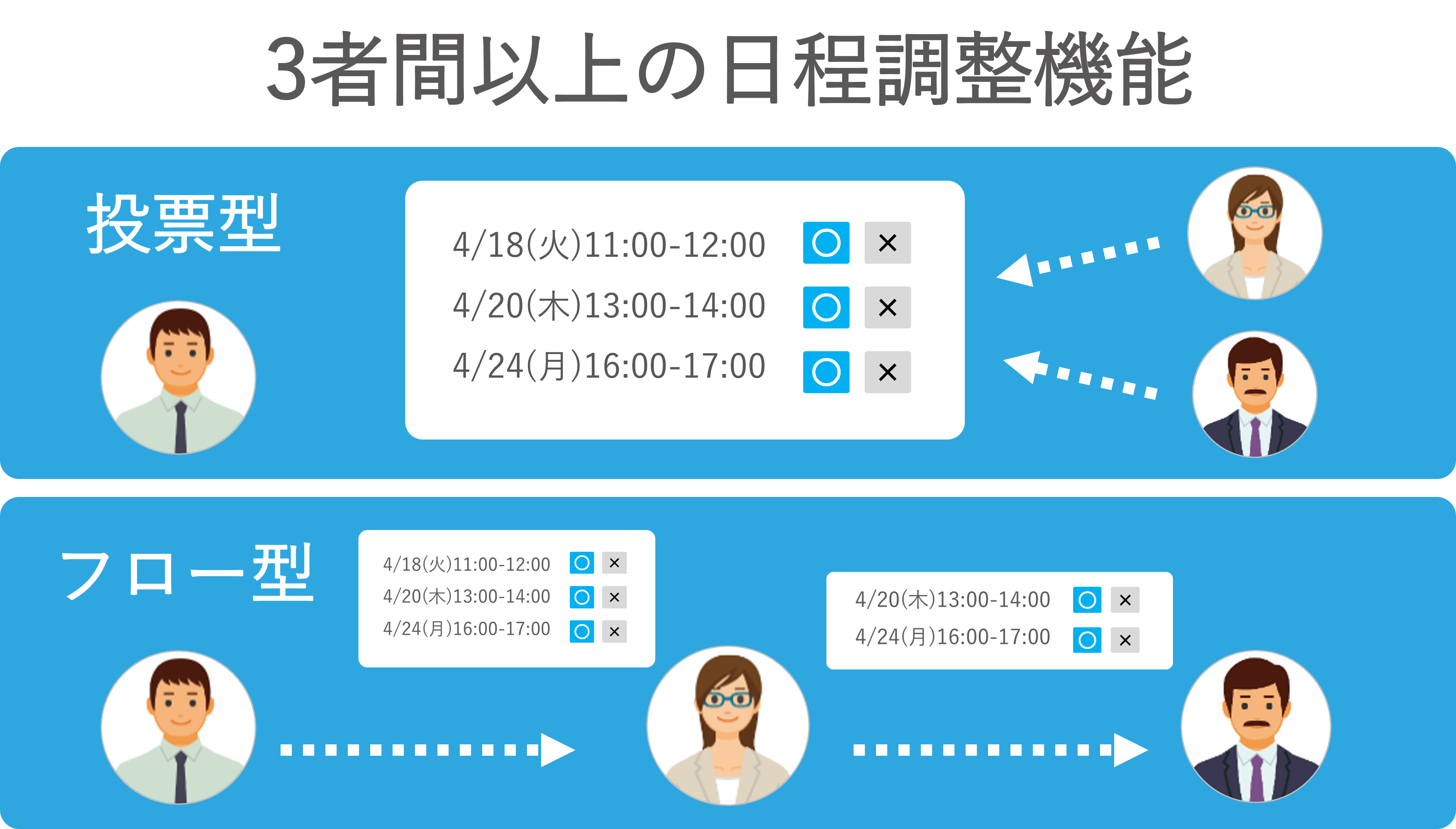 参加者に対して一斉に日程調整をおこなう「投票型」と順番に日程を確認する「フロー型」があります。