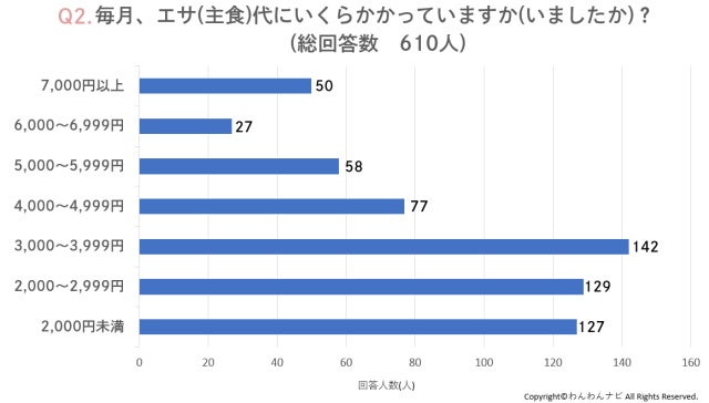 毎月のエサ(主食)代には、「3,000~3,999円」かけている家庭が最も多いことが分かりました。