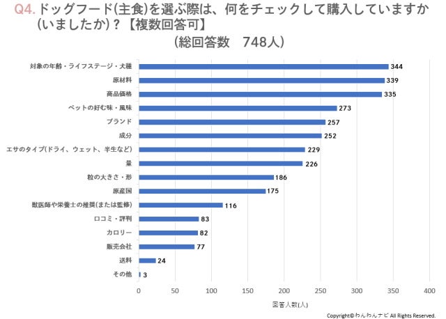- ドッグフードを選ぶ際は、「対象の年齢・ライフステージ・犬種」「原材料」「商品価格」をチェックして購入している人が多い