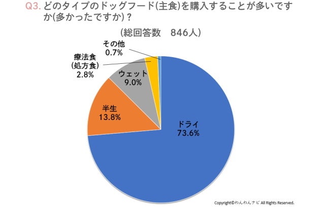 主食のドッグフードを購入する際は、「ドライ」タイプのエサを選ぶ方が73.6%と最も多いことが分かりました。
