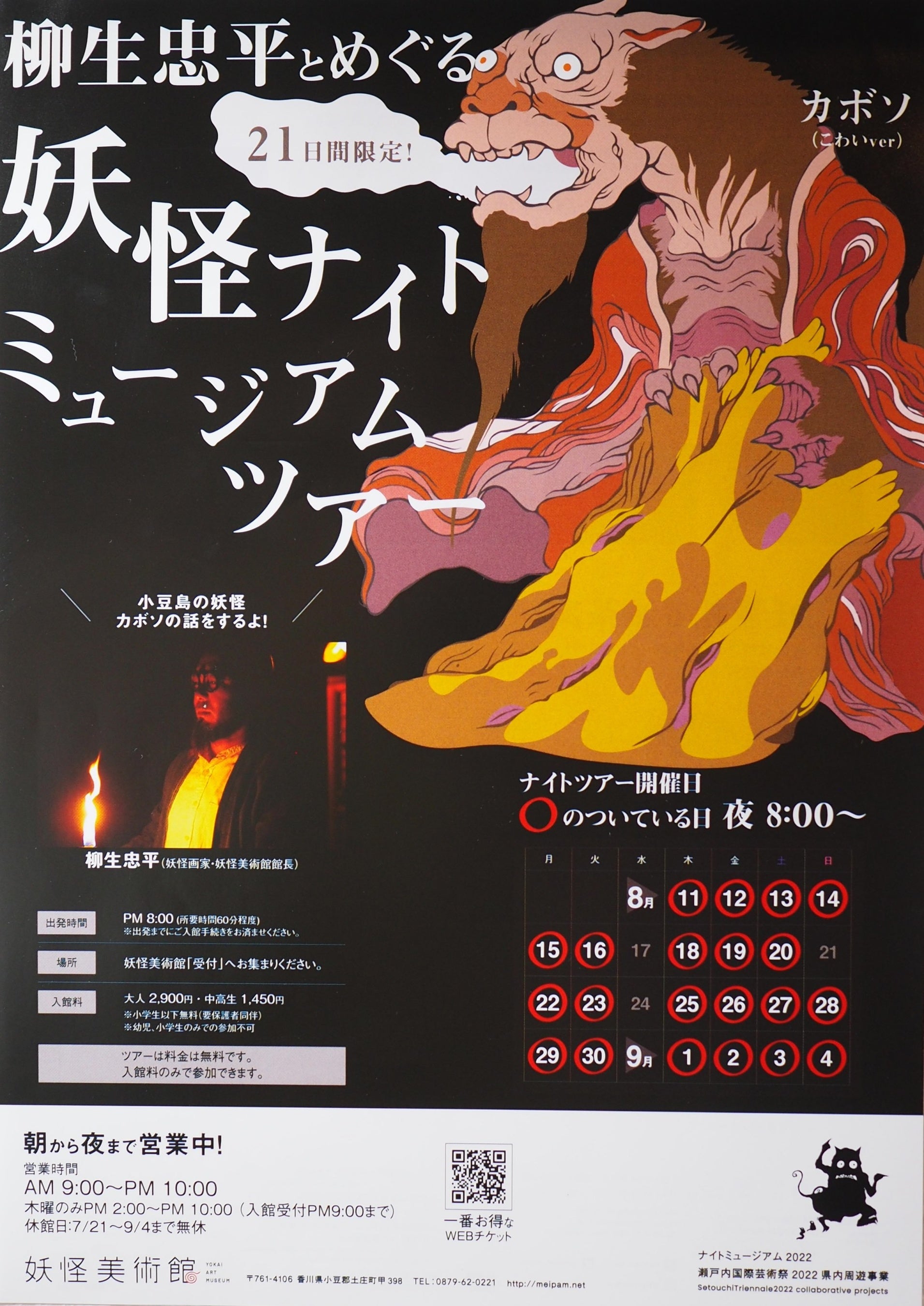 小豆島の「迷路のまち」(土庄本町)で、アート事業や地域事業をおこなう妖怪美術館(小豆島ヘルシーランド株式会社)は、瀬戸内国際芸術祭と夜の小豆島観光をさらに盛り上げるために、妖怪美術館館長でもある妖怪画家・柳生忠平とめぐるナイトミュージアムツアーを期間限定で実施します。