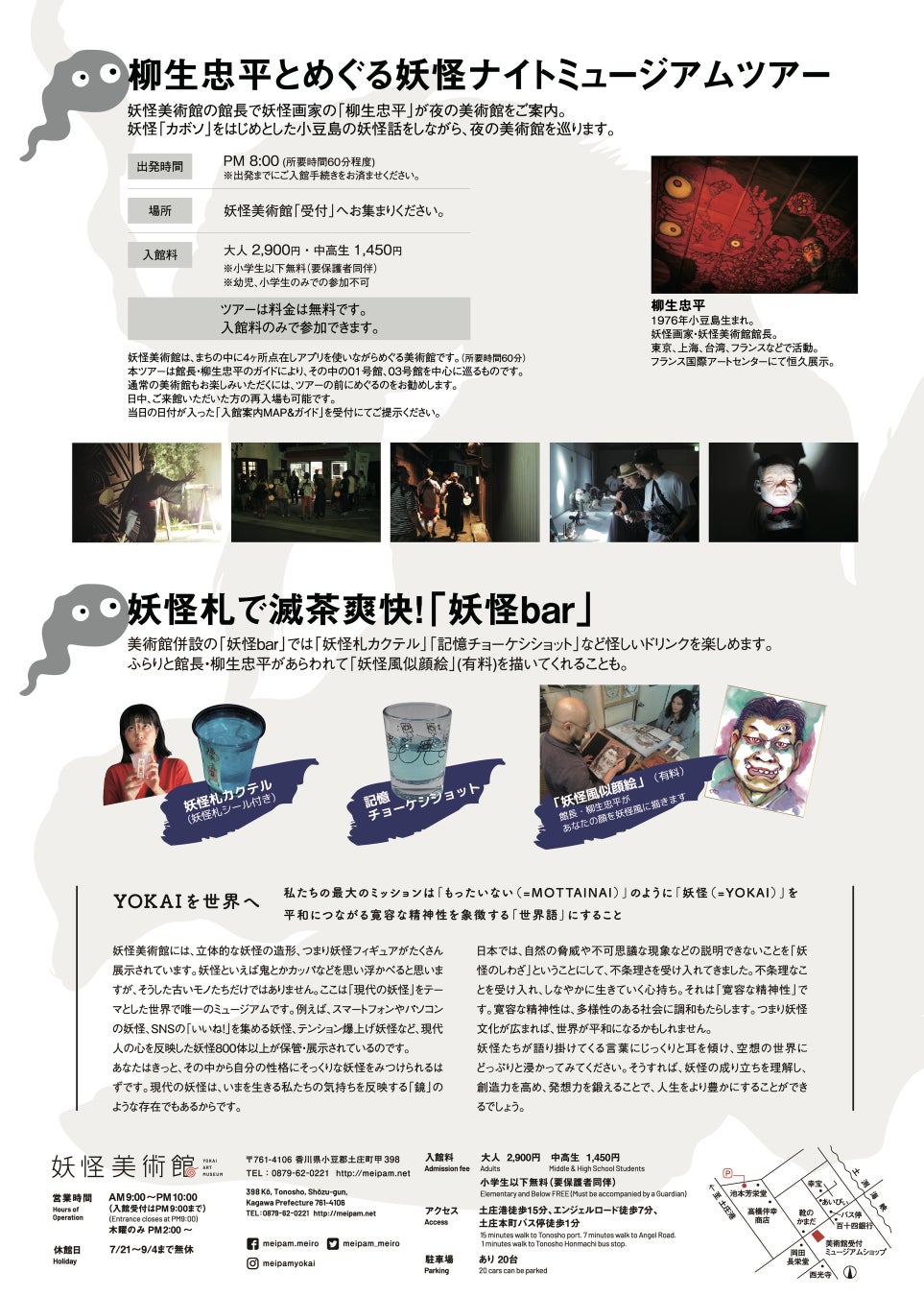 夜型観光の振興を目的に夜10時まで営業時間を拡大した妖怪美術館は、ミュージアムショップに妖怪barを新設。さらにこの夏は、瀬戸内国際芸術祭2022県内周遊事業として、夜もアート鑑賞を楽しんでいただけるよう館長(妖怪画家)である柳生忠平がご案内する妖怪ナイトミュージアムツアーを実施します。実施日の夜8時までに受付を済ませれば、入館料のみでご参加いただけます。ツアー後は館長の妖怪談義をツマミに妖怪barでオリジナルの妖怪カクテルなどもお楽しみいただけます。