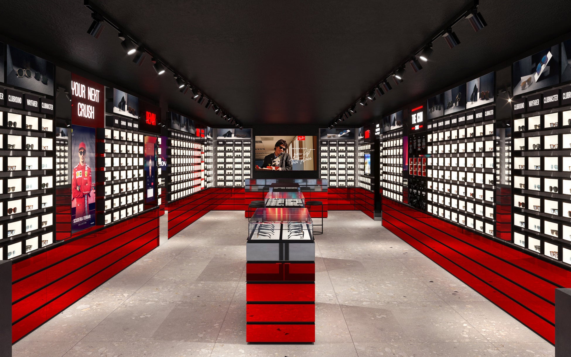 71㎡からなる新しい店舗は黒を基調にブランドのアイコニックな赤を内装に取り入れた、クリエイティブなスピリットを体現する内装となっています。アイコンから新作コレクションまでメガネフレームとサングラス合わせて約470種のアイウェアを取り揃えています。