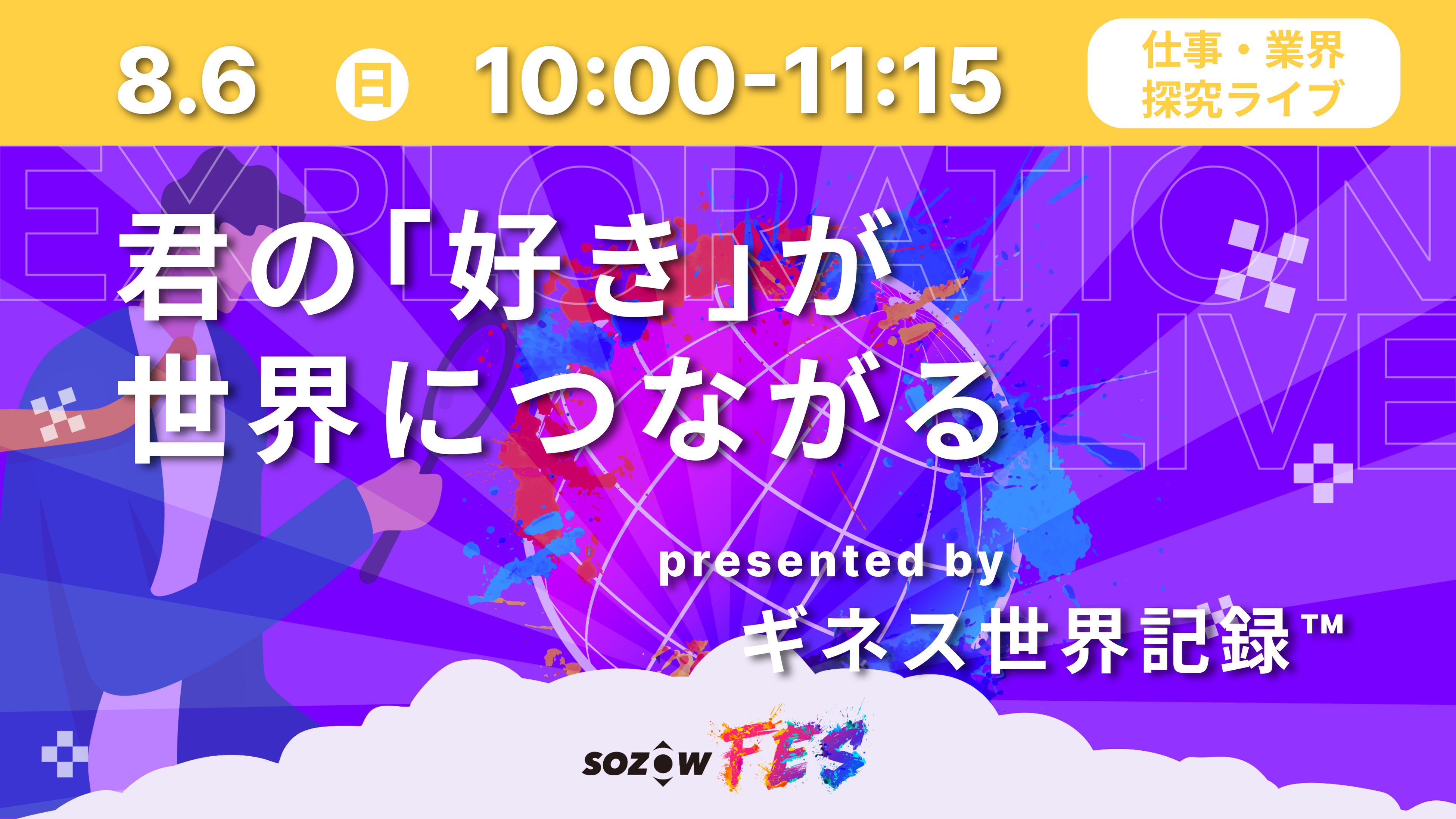 「世界をよりおもしろく、楽しく、ポジティブな場所にする」ことをブランドの目的に掲げるギネス世界記録™は、「子どもの興味が広がり、夢中になれるものとの出会いの場を作る」という「SOZOW FES 2023 Summer with テレビ朝日」のイベント主旨に共鳴し、このたびの参加となりました。オンラインライブでは、日本人で初めてのギネス世界記録公式認定員となり、過去に300以上の記録を審査してきた石川が、思わず人に教えたくなる世界一、試したくなる世界一を紹介しながら、やりたいこと、好きなことを突き詰めて、世界一となった挑戦者の話から「好き」のパワーについて子どもたちと考えます。