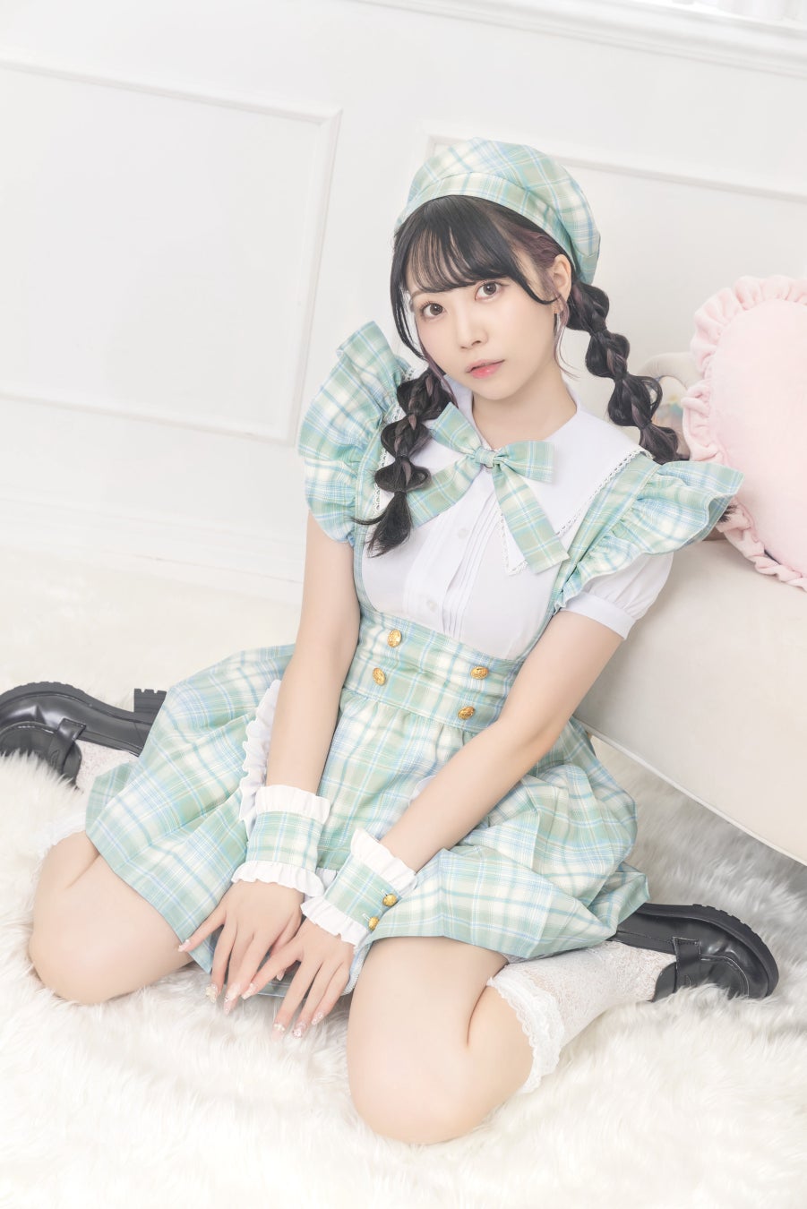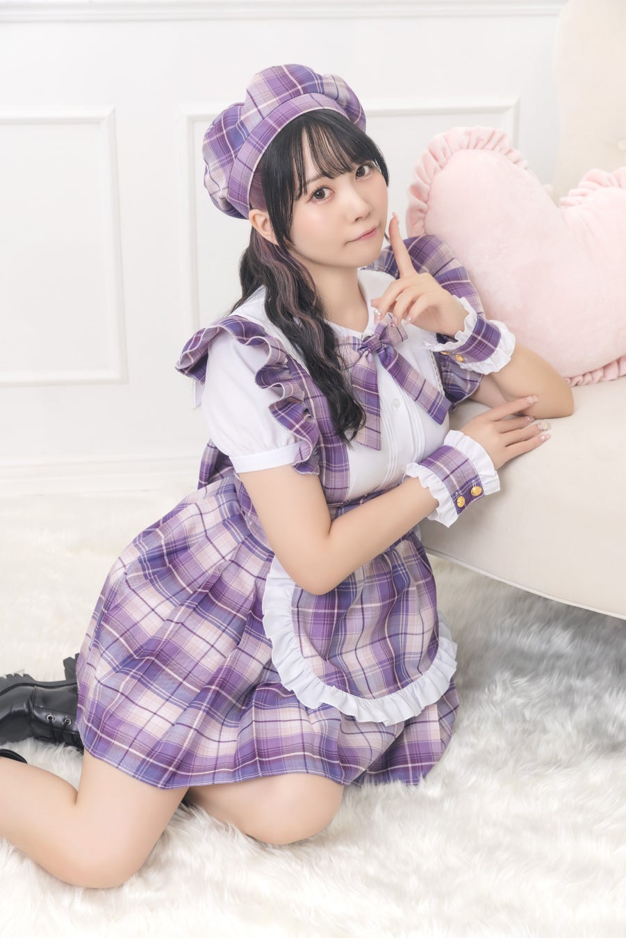 この商品は、アイドルのような爽やかなチェック柄とメイド服には珍しいベレー帽が特徴です。大好評のブルー、ピンク、イエローに続き、新色のミントとパープルがAmazon限定カラーとして追加されました。