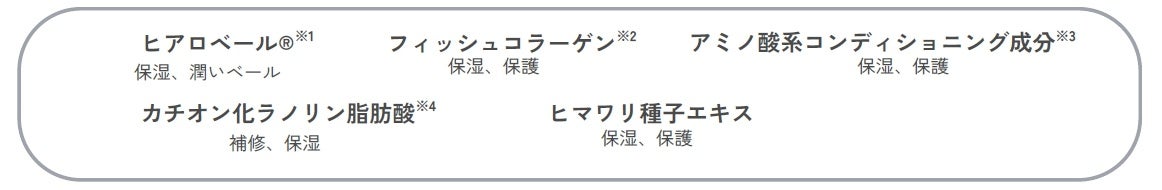 キューティクルが剥がれて保湿能力が低下した髪は、ダメージが内部にまで及びやすくなります。ヒアルロン酸誘導体「ヒアロベール®※1 」が髪表面に高吸着し、潤いのベールで包み込みます。また、「フィッシュコラーゲン※2」や「アミノ酸系コンディショニング成分※3」が髪本来のしなやかさと柔軟性を与え、18MEA(18-メチルエイコサン酸)を含む「カチオン化ラノリン脂肪酸※4」がダメージを補修して静電気を防ぎます。さらに、「ヒマワリ種子エキス(保湿)」がパサつきを抑えて艶やかでまとまりのある髪へと導きます。