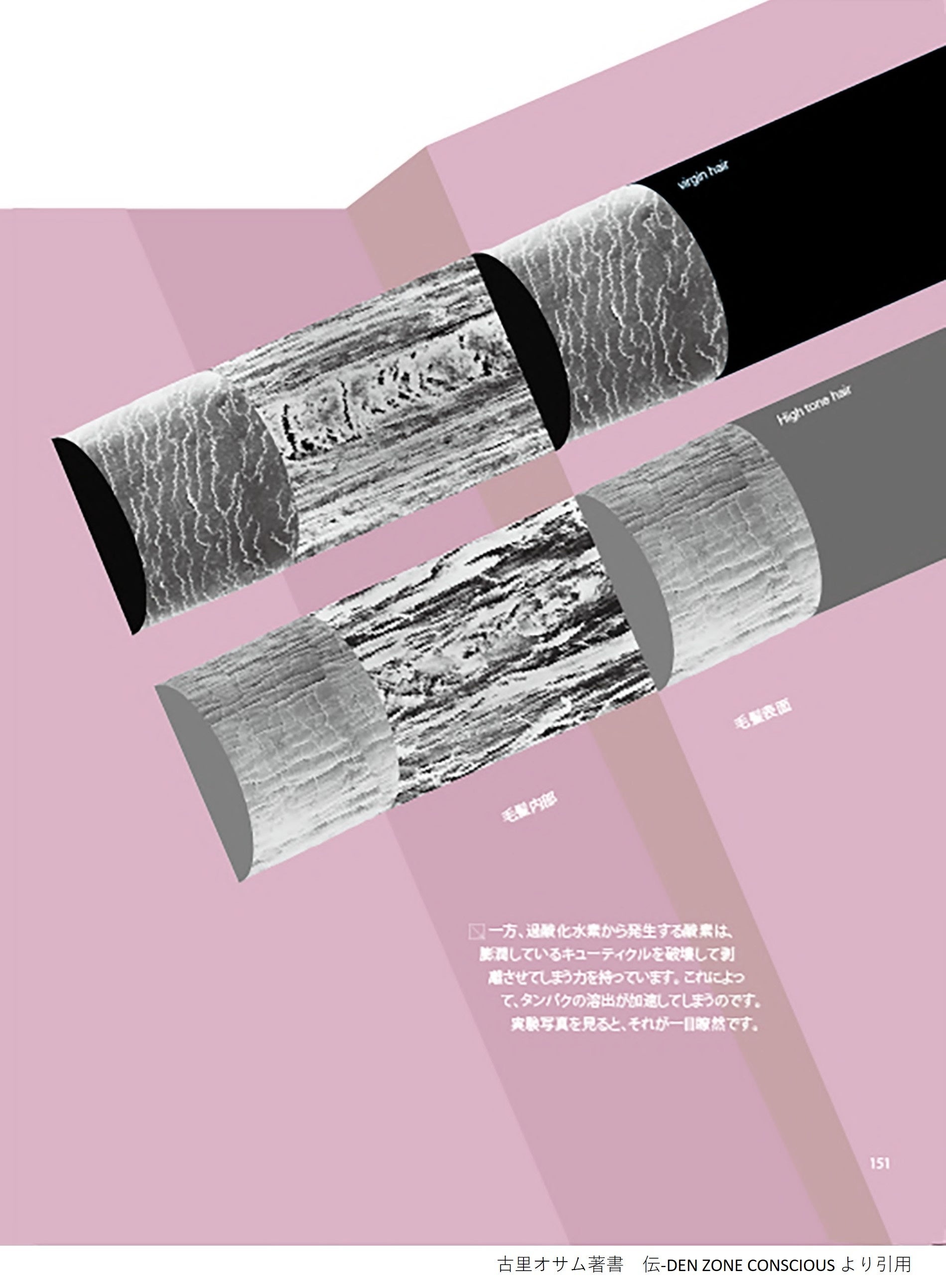 髪は、18種類のアミノ酸から組成された“タンパク質”をメインに形成されています。ヘアカラーやパーマなどを繰り返すと、髪の内部の化学的な結合が切断されて髪自体が弱くなり、キューティクルがはがれ、髪内部のタンパク質やアミノ酸、脂質が流出してダメージが進んでいきます。