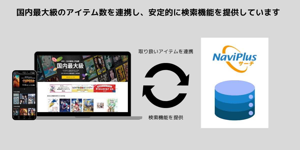 「NaviPlusサーチ」を「TSUTAYA DISCAS」のDVD・CD・コミックを取り扱う各サイトとアプリに導入し、ユーザーに対して一貫性のある検索体験を提供することで、シームレスに希望商品に到達できる利便性の高い購買プロセスを実現します。また、統合された検索システムにより、運用管理が効率化され、チューニングなどの運用コストが削減されるとともに、サイト全体のパフォーマンスが向上します。