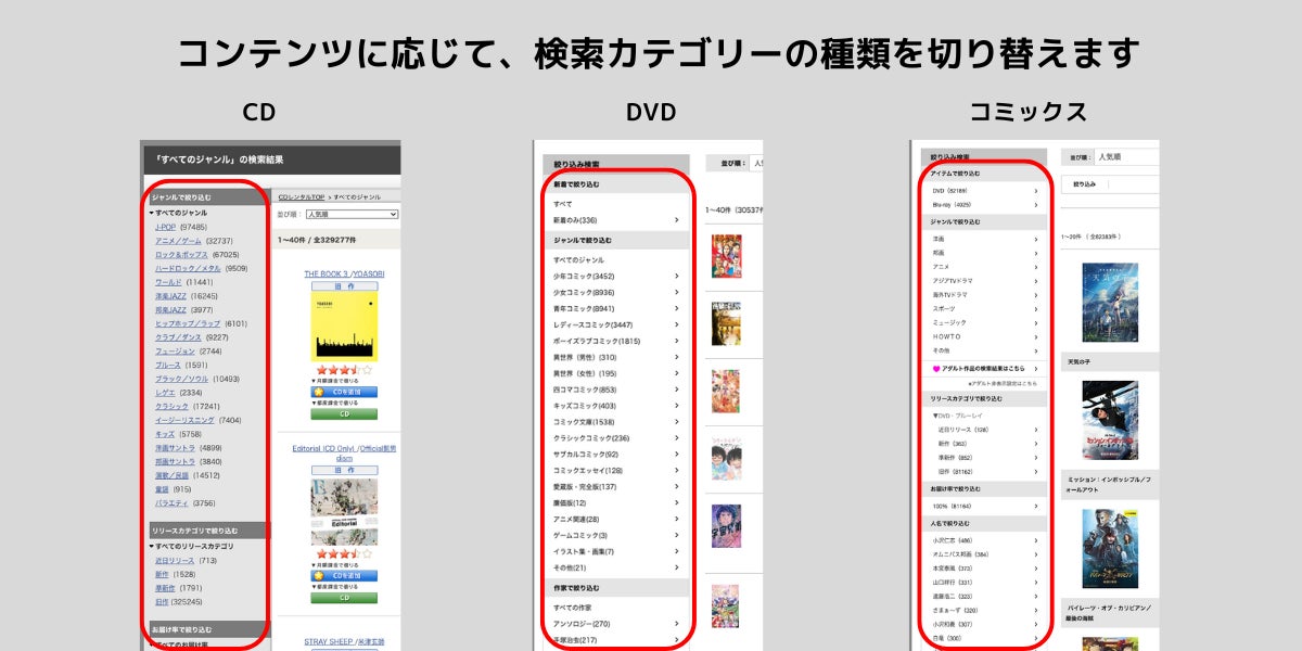 DVD、CD、コミックそれぞれで、検索できるカテゴリーの種類を切り替えて表示し、ユーザーに快適な検索体験を提供しています。また、絞り込み検索時には「ファセットカウント」機能を活用し、検索結果のヒットアイテム数をあらかじめ表示します。