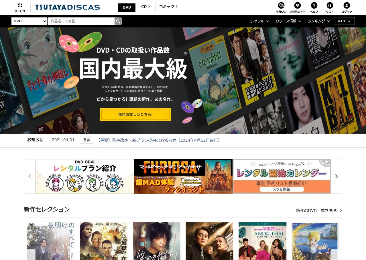 「TSUTAYA DISCAS」はDVD・CD取り扱いタイトル数国内最大級のネット宅配レンタルサービスです。借りたい作品をパソコンやスマートフォンから予約するだけで、ご自宅にお届けします。エンタメ界の「国会図書館」を目指すTSUTAYA DISCAS。配信サービスにない作品も、映画ファンや音楽ファンお気に入りの名作も、DISCASならきっと見つかるはず。