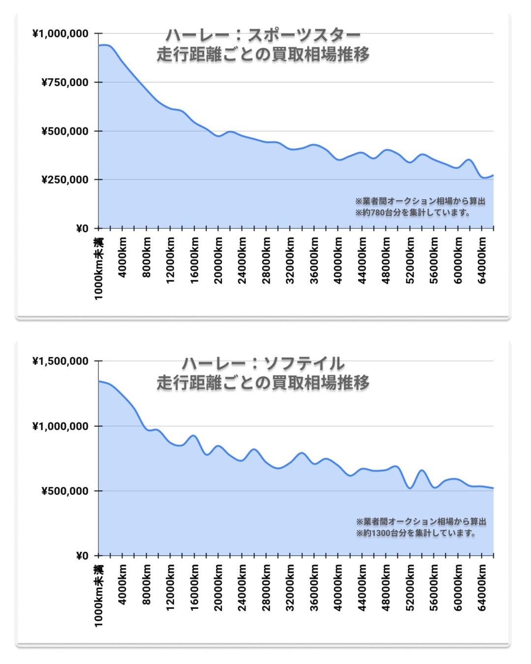 以下はスポーツスターとソフテイルの走行距離ごとの買取相場の推移グラフになります。
