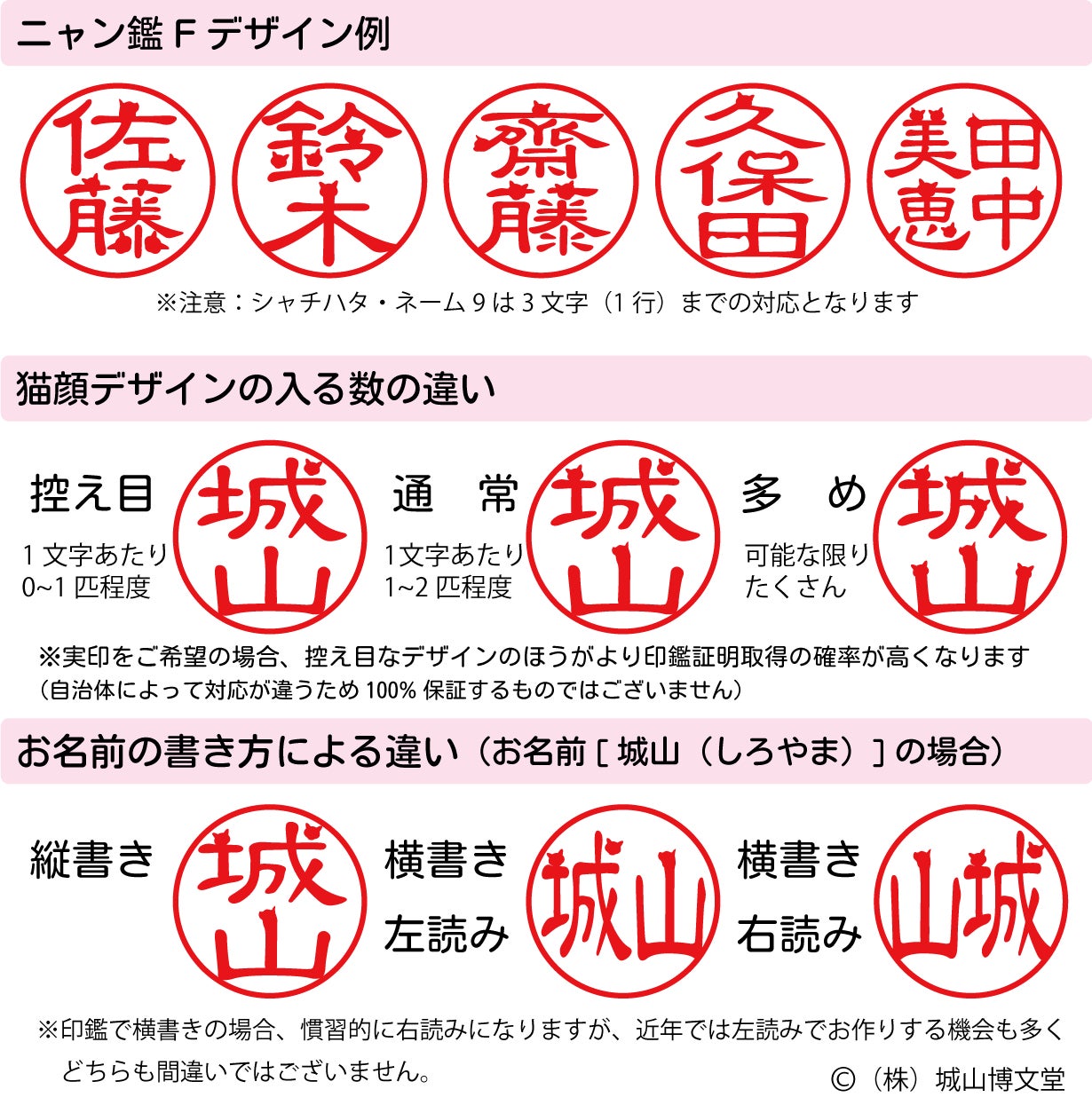 株式会社 城山博文堂では、文字の一部に猫顔のデザインが潜む印鑑「ニャン鑑F」を 1月15日にクラウドファンディング[Makuake]で先行発売しました。