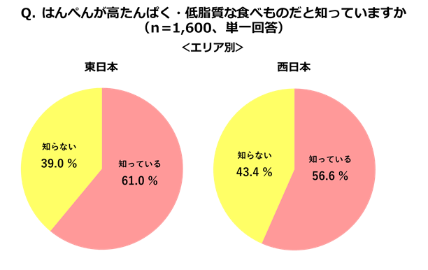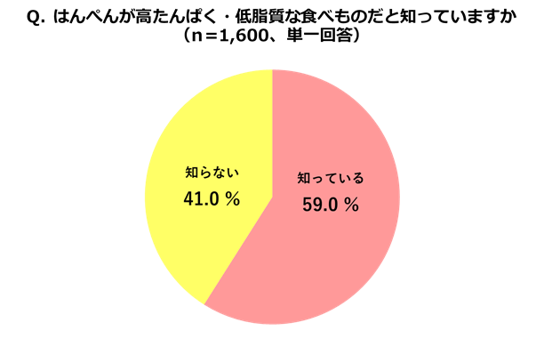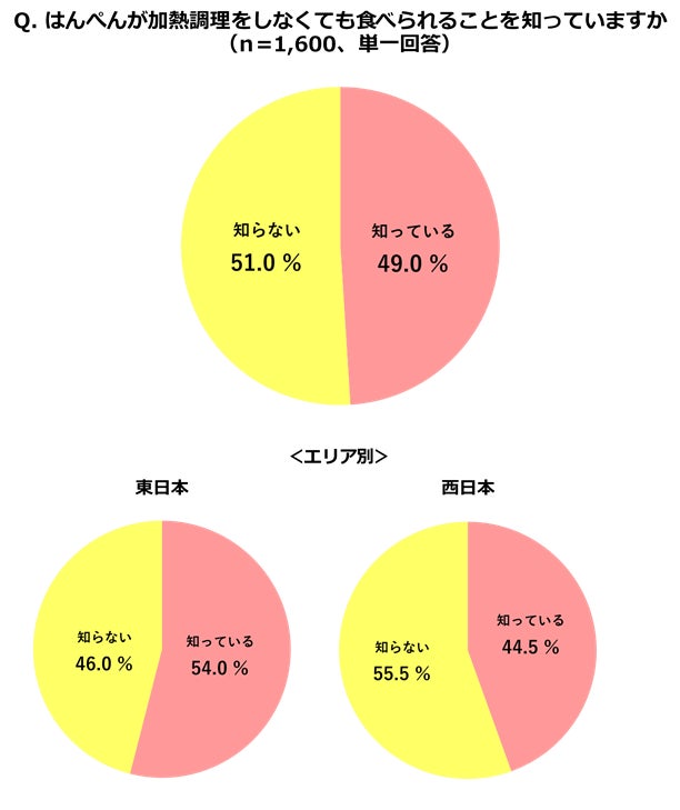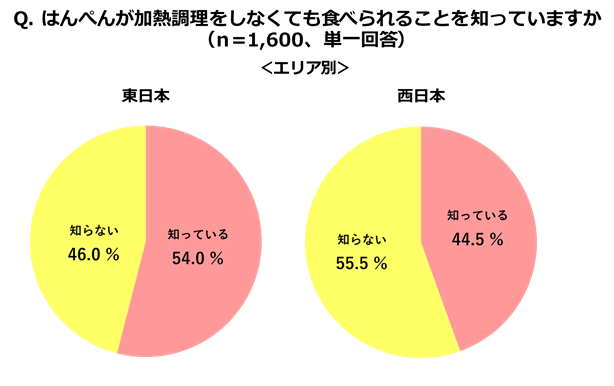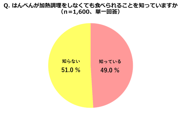 はんぺんは製造段階で加熱(ゆでる)をしているため、そのままでおいしく食べることができます。しかし、そのことを知らないとの回答が51%にのぼることがわかりました。約半数の方が、「はんぺんは加熱しなければ食べられない」と思っているようです。