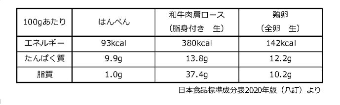 実ははんぺんは高たんぱく・低脂質な食材のひとつ。牛肉や鶏卵と比べると同程度のたんぱく質量を持ちながらエネルギーと脂質が低いことがわかります(下表)。
