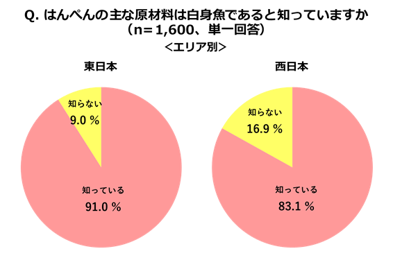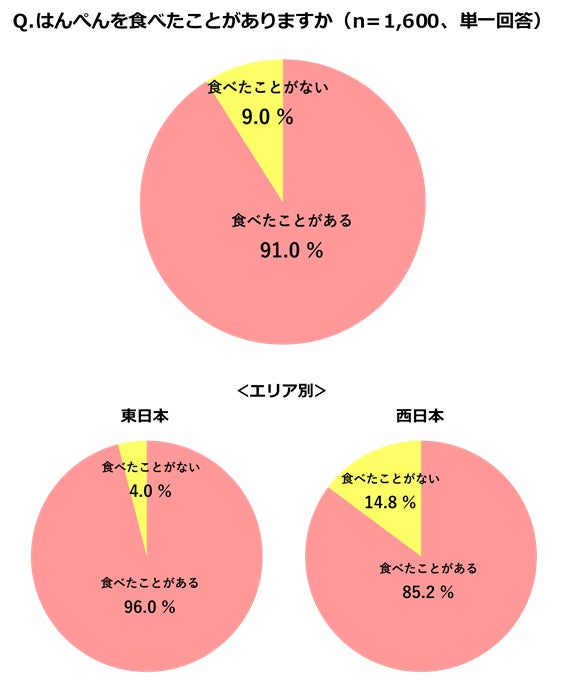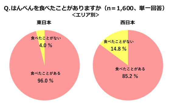 はんぺんの喫食経験をたずねたところ、91%の人が「食べたことがある」と回答。西日本でも85.2%と、今や全国で多くの方に召しあがっていただいているようです。