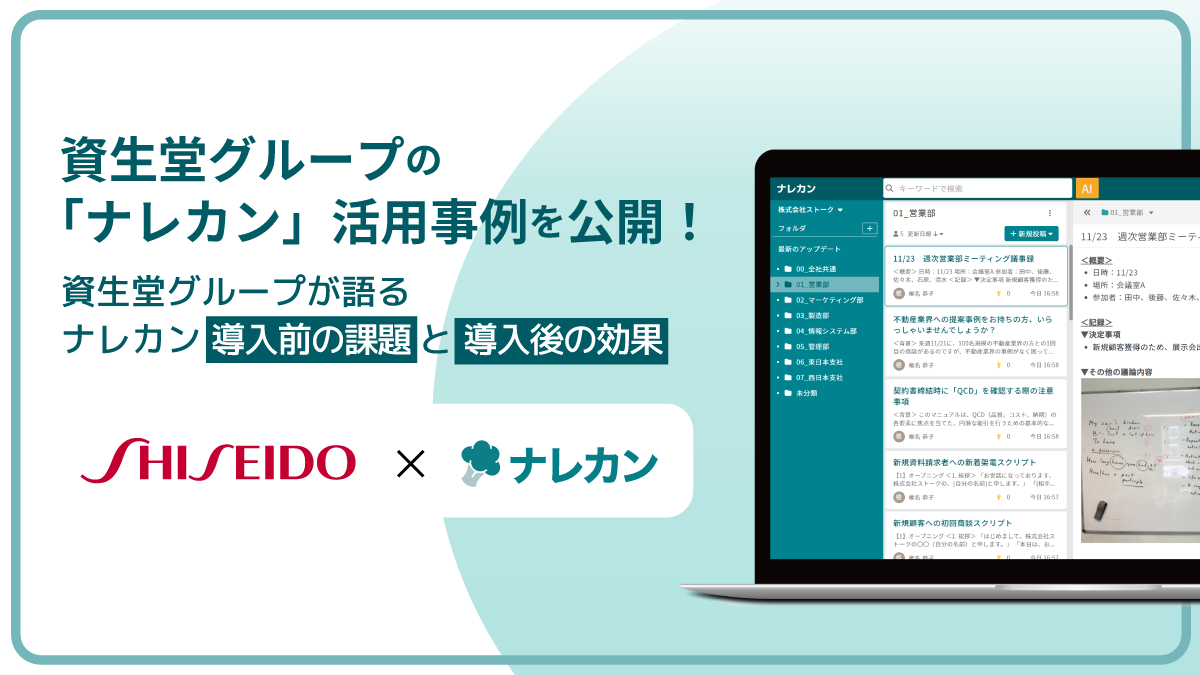 株式会社Stock(代表取締役社長:澤村 大輔、本社:東京都中央区、以下「当社」)は、株式会社 資生堂(代表執行役 社長CEO:藤原 憲太郎、本店所在地:東京都中央区、以下「資生堂グループ」)が、当社のナレッジ管理ツール『ナレカン』を活用したナレッジ管理の取り組みについて語る導入事例インタビュー記事および動画を公開したことをお知らせいたします。