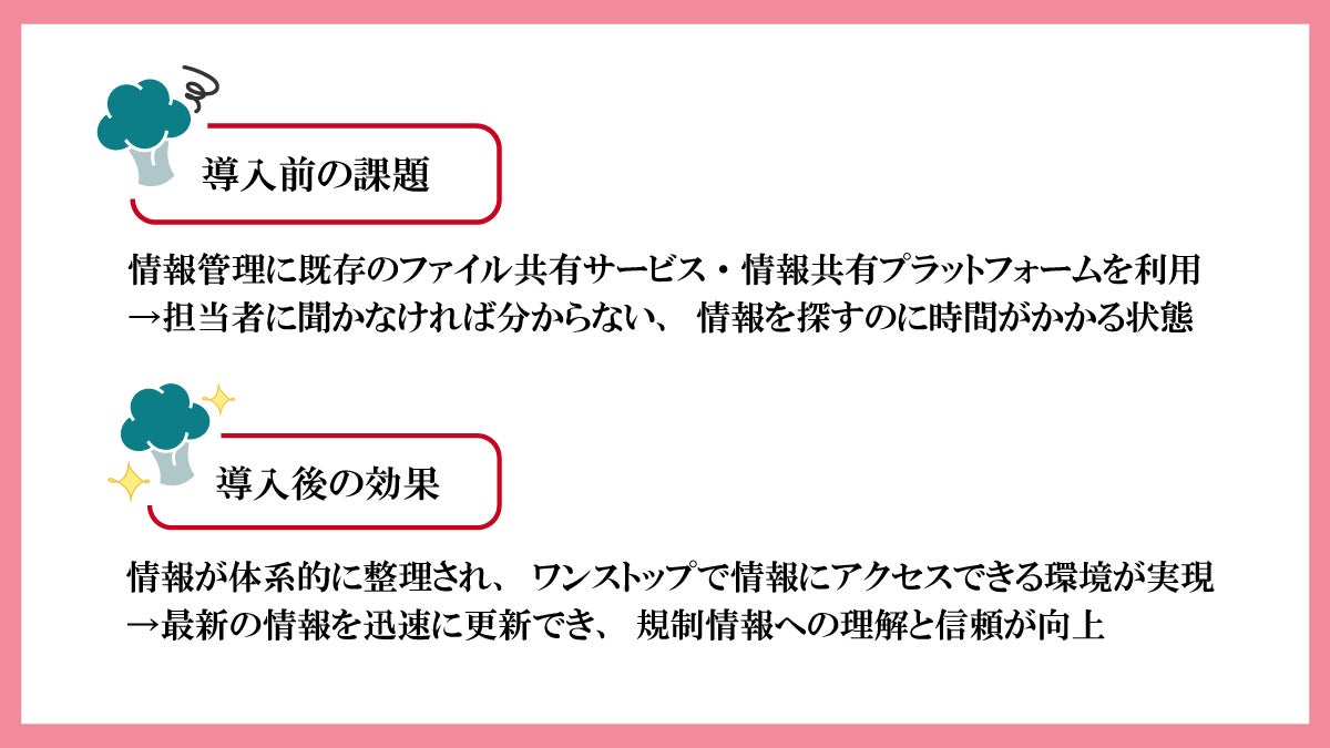 グローバル規制部では「ナレッジ管理が担当者に依存しがちで、担当者に聞かないと分からない」「情報が整理されておらず、情報を探すのに時間がかかっている」という課題がありました。