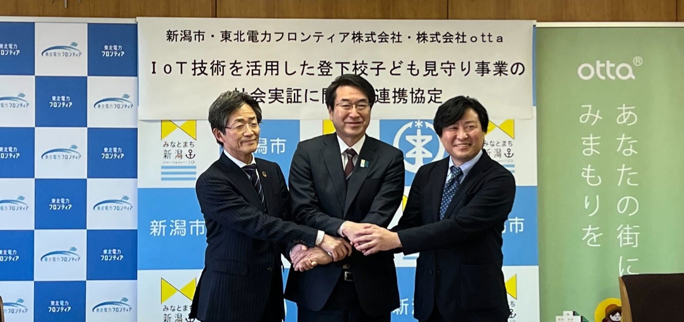 株式会社otta(本社:福岡市博多区、代表取締役社長:山本文和、以下「otta」)は、3月20日(月)、新潟市(新潟市長:中原 八一)および東北電力フロンティア株式会社(本店:宮城県仙台市、取締役社長:岡信 愼一)と、「IoT技術を活用した登下校子ども見守り事業の社会実証に関する連携協定書」を締結しました。