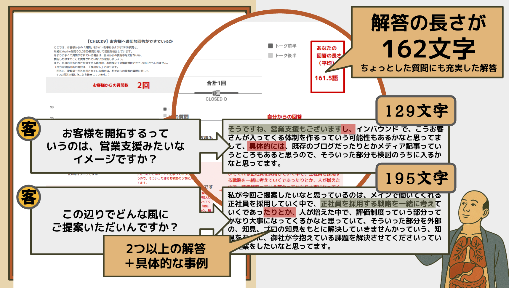 相手の問いに対し、結論だけで止めず、補足情報や選択肢、具体例を添えて“情報価値を上乗せする回答”が、納得形成を前に進める要因として抽出されました。