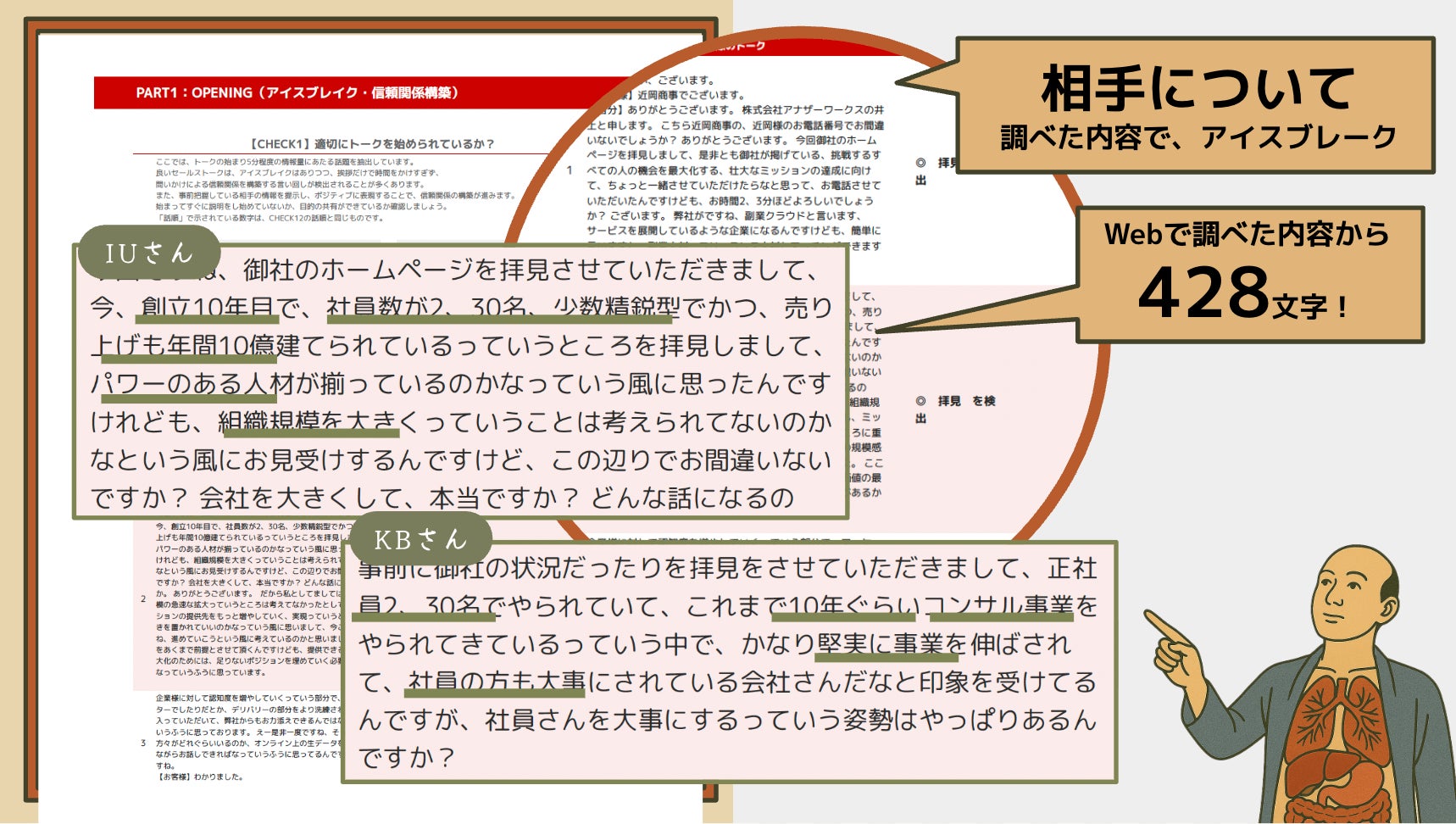 成果を出す営業は、冒頭から自社説明に入らず、相手企業の情報を事前に把握したうえで“相手起点”で会話を開始し、信頼を先に獲得する傾向が見られました。