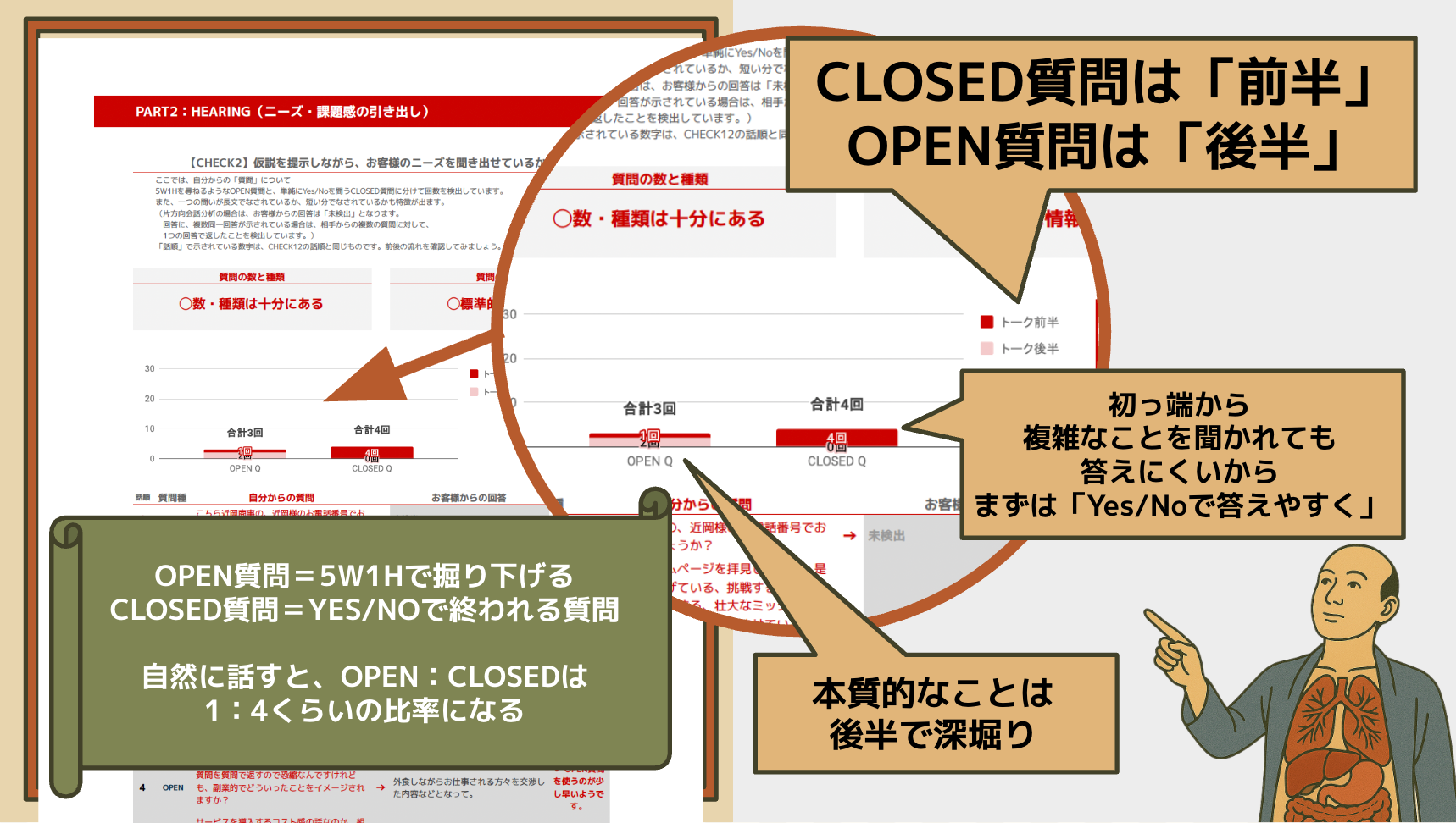 最初はYes/Noで答えやすい質問でハードルを下げ、その後に深掘りの質問へ切り替えることで、相手が自然に話しやすい流れを作る構造が確認されました。