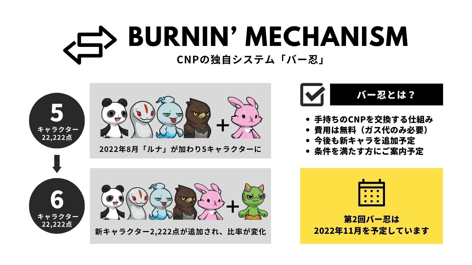 「ヤーマ」が登場するのは、今年11月に開催予定の第2回「バー忍」。バー忍は、既存のNFTをバーン(焼却)し、新キャラクターに交換するCNP独自のシステムです。今年8月に開催した第1回バー忍では、ウサギの「ルナ」が新キャラクターとして登場し、発行済みNFT22,222点のうち、10%にあたる2,222点を入れ替えました。キャラクターとの出会い・別れを体験できるイベントとして、今後も継続的な開催を予定しています。