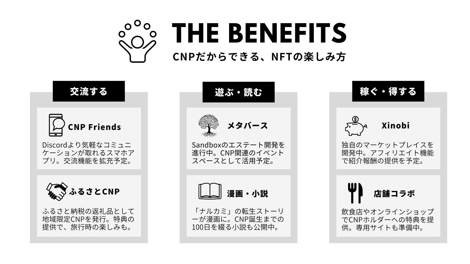 また、NFTプロジェクトとその応援者・ホルダーをつなぐ、独自のマーケットプレイス「Xinobi(忍)」を開発中。さらに、9月にリリースした「ふるさとCNP(※)」も、全国の自治体様から多数のお問い合わせをいただいております。