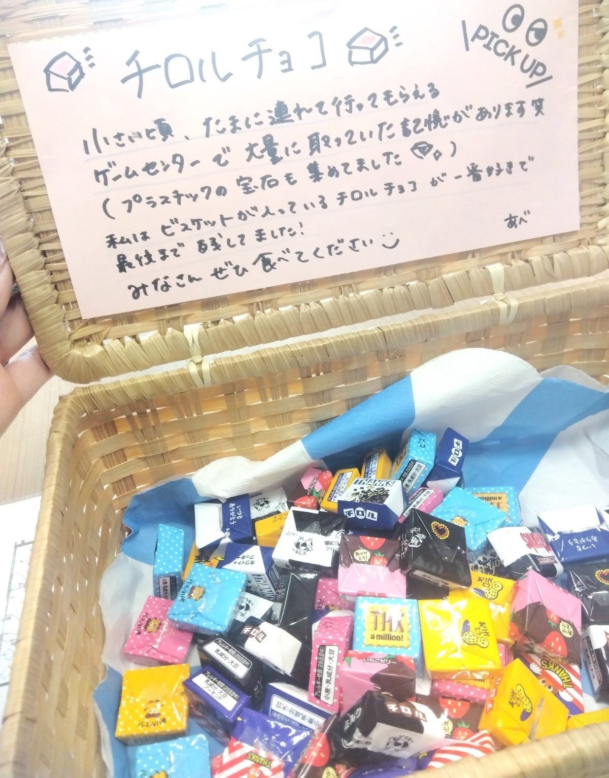 小さい頃、たまに連れて行ってもらえるゲームセンターで大量に取っていた記憶があります。プラスチックの宝石も集めていました。私は、ビスケットが入っているチロルチョコが一番好きで、最後まで残していました!みなさん、ぜひ食べてください。
