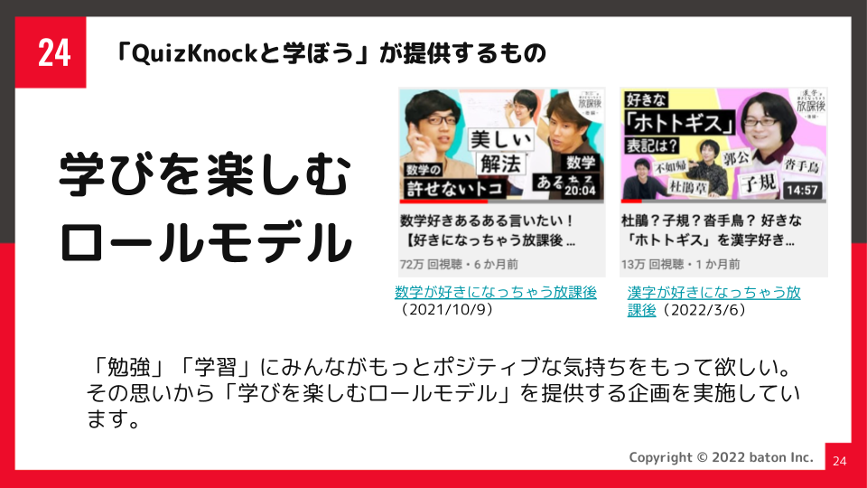 当日の講演テーマは「YouTubeで広がる学びの世界 QuizKnockが提案する新しい学び」。プレゼンターとして、QuizKnockの伊沢拓司、須貝駿貴が登壇し、QuizKnockの対ユーザ戦略や、「QuizKnockと学ぼうチャンネル」が提供する価値についてお話しました。