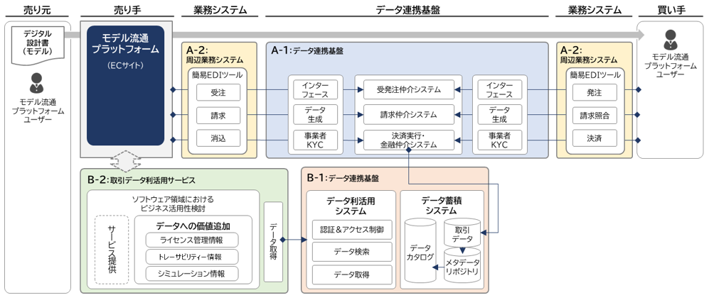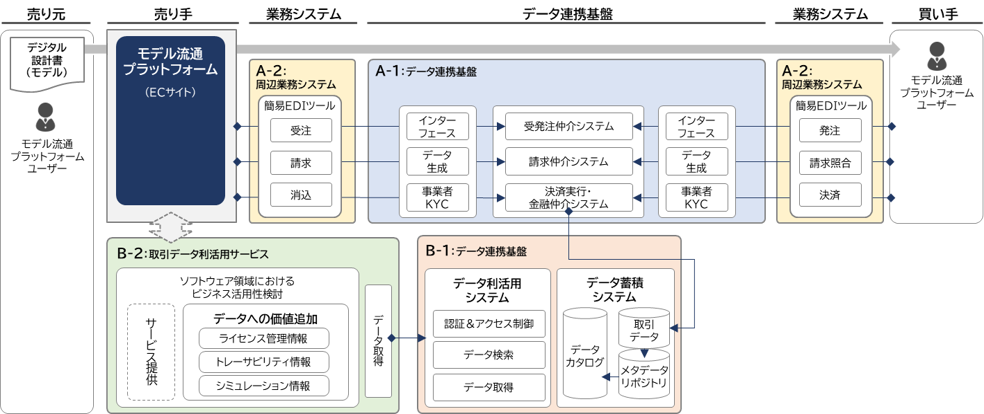 本テーマでは、DADC※2が設計した次世代取引基盤のアーキテクチャー※3に基づき、Society5.0を実現する未来基盤として、自動車産業のソフトウェア分野における受発注・請求・決済に関わる一連の各取引をデジタル完結させるために、取引で使うデータの決まりや、企業を識別するための手法などを具体化させます。また、デジタル完結させるための基盤を試作し、取引がデジタル完結できるかどうかの実証実験を行います。さらに、ソフトウェアを対象とした取引データを蓄積し、利活用するシステムを研究・開発することで、トレーサビリティーなどの取引データの付加価値を向上させる新たなサービスを検討します。