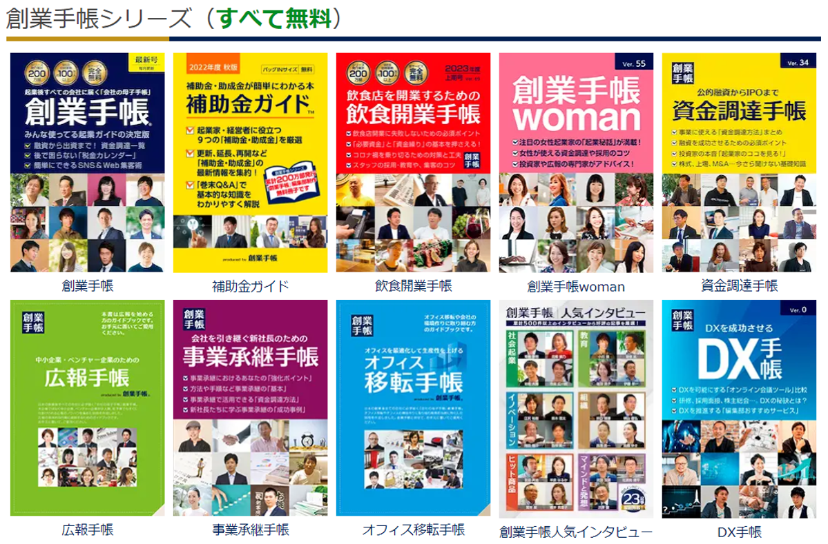 創業手帳は起業後の全法人に送付される全国の銀行やシェアオフィスに設置されている起業家に役立つ無料の経営ガイドです。
