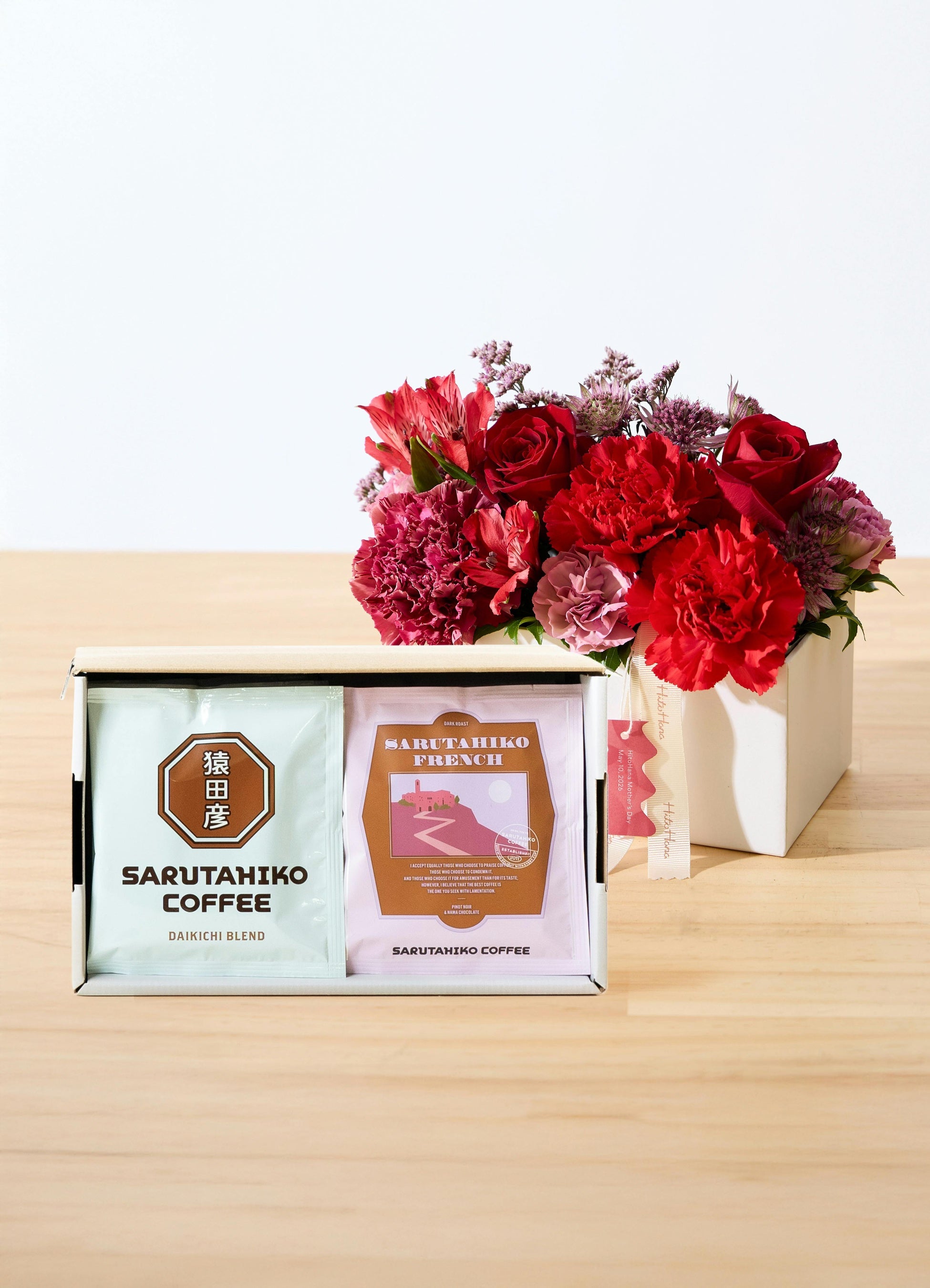 【母の日】猿田彦珈琲 ドリップバッグギフト【大吉ブレンド・猿田彦フレンチ】とバラとカーネーションのアレンジメント レッド S スクエア