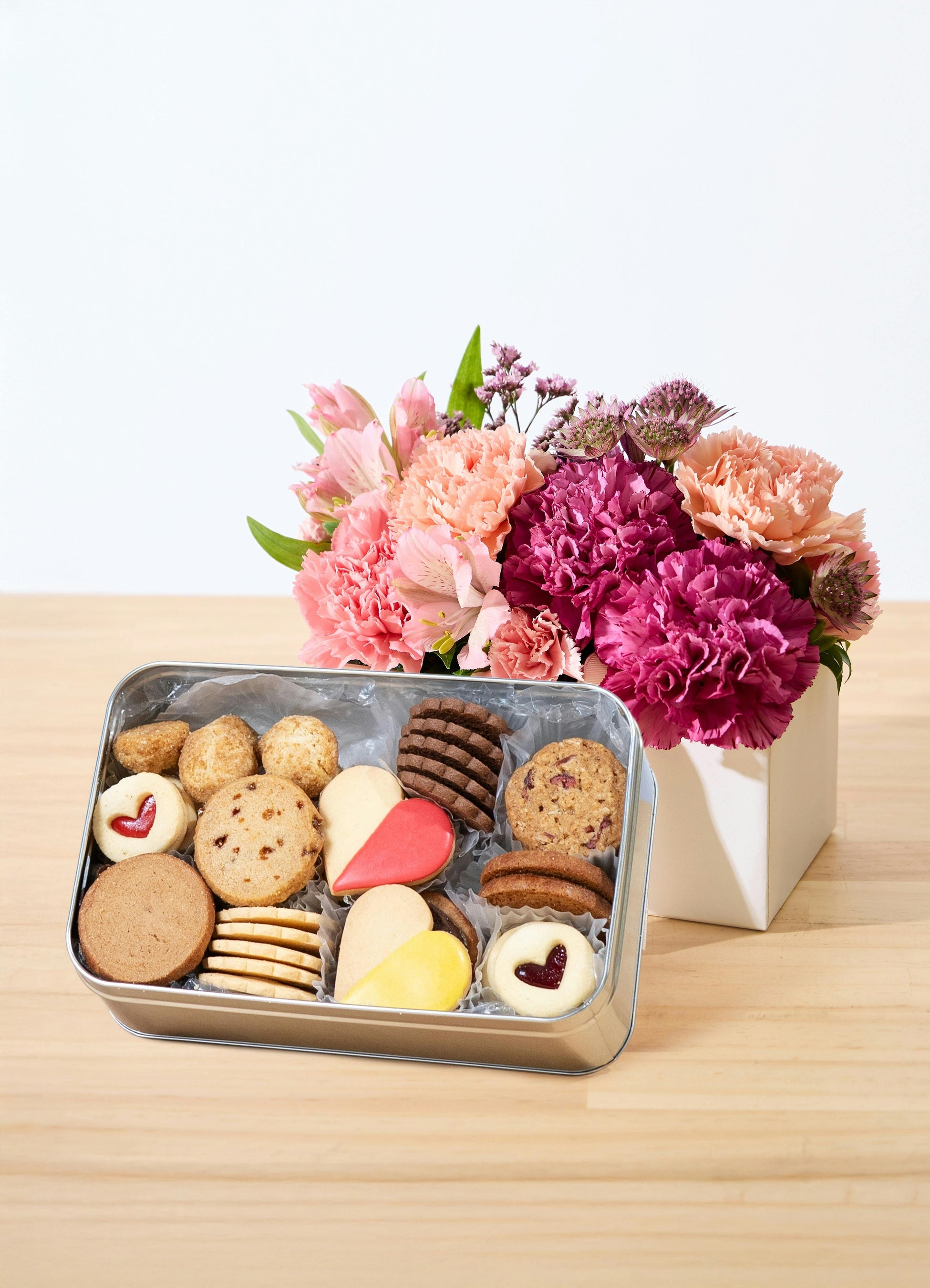 【母の日】DEAN & DELUCA アメリカンクッキー缶とカーネーションのアレンジメント ピンク S スクエア