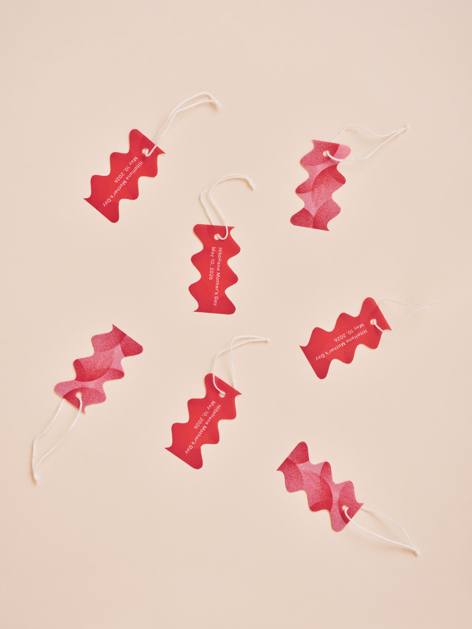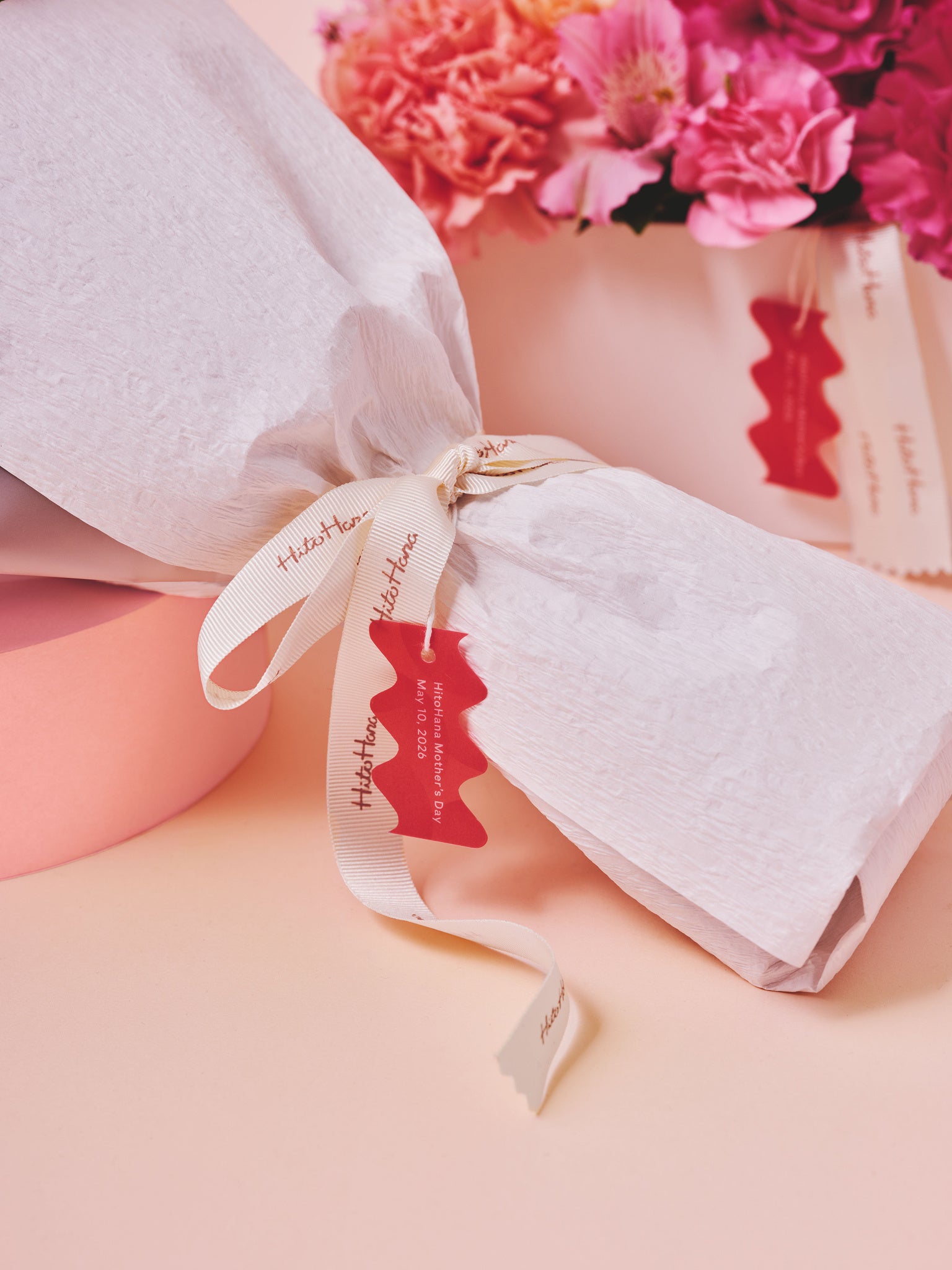 「カーネーション」の美しい花びらと、優しさ・柔らかい愛情をイメージしたウエーブがモチーフの母の日タグを、HitoHanaのロゴ入りリボンで結びつけています。母の日だけの特別なプレゼント仕様でお届けします。