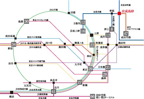 「京成高砂」駅は、京成本線・金町線・成田スカイアクセス線、北総線の4路線が乗り入れる、23区東部の交通の要衝の一つ。千葉方面は北総線から成田スカイアクセス線へ、東京方面は京成押上線から都営浅草線、京急本線、京急空港線へつながる、計7路線がネットワークする広域路線の一角にあり、都心アクセスはもちろん、羽田・成田の両空港に直結するという優れたアクセス力を発揮します。