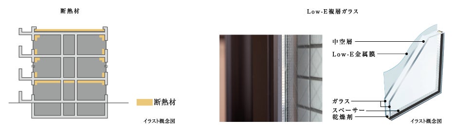 複層ガラスに特殊な金属製のLow-E膜をコーティングしたLow-E複層ガラスを採用。高い断熱性能と日射遮蔽性能を発揮し、室内の温かさや涼しさを室外に逃さない断熱性能を持ちながら、太陽の日射や照り返しといった熱の流入を遮断することで、室内を快適に保ちます。